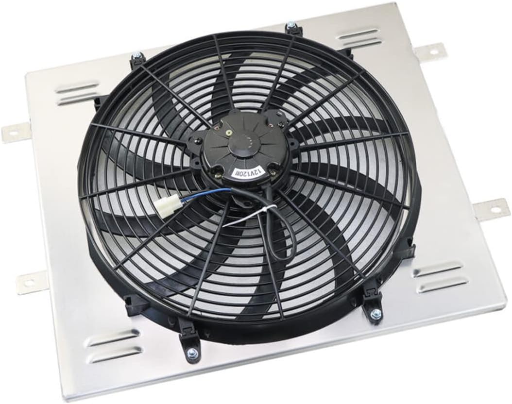 The size of radiator which the shroud fan fits:Core size : 18 1/2" high x 20" wideOverall Size : 23 1/2" high x 25 1/2" wideVehicle Fitment:For 1987-1990 Jeep Wrangler 4.2LFor 1987-1995, 1997-2002 Jeep Wrangler 2.5LFor 1991-1995, 1997-2006 Jeep Wrangler 4.0LFor 2003-2006 Jeep Wrangler 2.4LFor 2006 Jeep TJ 4.0LFor 2006 Jeep TJ 2.4LFor 1987-2006 JEEP WRANGLER YJ/ TJ/ LJ(SE/ Sport/ X Sport/ Sahara Sport/ Rubicon Sport)(Fits Models with l4/ l6 2.4L/ 2.5L/ 4.0L/ 4.2L OHV/ DOHC Engines ONLY)Fans Details:Diameter: 16'' (Blade to Blade)Voltage: DC 12 VoltsWattage: 120 WattageNumber of Blades: 10 S-Type bladesMaximum Fan CFM (Cubic Feet per Minute): 3,000 cfmMaximum Fan RPM(Revolution(s) Per Minute0: 2000±10%Amp Draw: 10ampFan Thickness: 3.27"S-Type Blade pull push design, to make air flow more efficient and bring more cooling EffectPowerful 120 watt motor will keep your engine coolThermostat Kit:Universal fit for any automotive vehicle and electric fan.Activates by grounding electric fans at preset temperature.180'F turn-on temperature, 165'F turn-off temperature.RED + connect directly to battery.WHITE wire to ignition switch power source.BLACK goes to thermos switch.BLUE wire goes to the Fans.This set up will run Fans & pull air in through radiator.