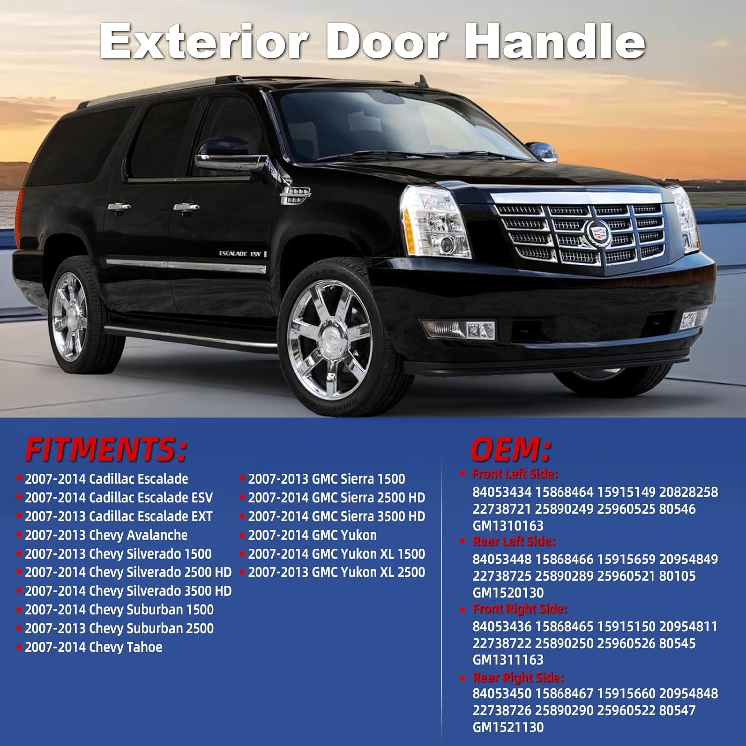 | Item Type Name | Exterior chrome door handle Compatible with Cadillac Escalade ESV EXT Chevy Avalanche Silverado 1500 2500 3500 HD Suburban 1500 2500 Tahoe GMC Sierra 1500 2500 HD 3500 HD Yukon XL 1500 2500 2007 2008 2009 2010 2011 2012 2013 2014 |