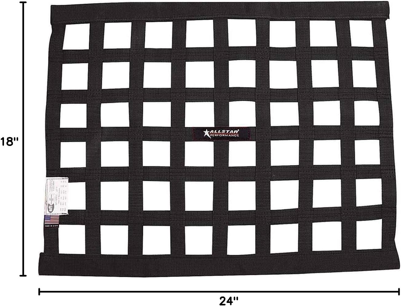 Allstar Black 18 inch High x 24 inch Wide Rectangular Border Style Mount Ribbon Window Net is a border style mount and has a rectangle shape. It measures 18 inches high x 24 inches wide and meets sfi 27.1 specifications and is tagged appropriately. The color is black and is made from durable quality polypropylene which is ideal for a variety of full-bodied race cars. The webbing is double-stitched with heavy nylon thread. The other colors available in rectangle sizes from Allstar are 10286 (blue) and 10284 (red). The square nets (18 inches h x 18 inches w) are also available from Allstar: 10280 (black), 10281 (blue) and 10282 (red)..