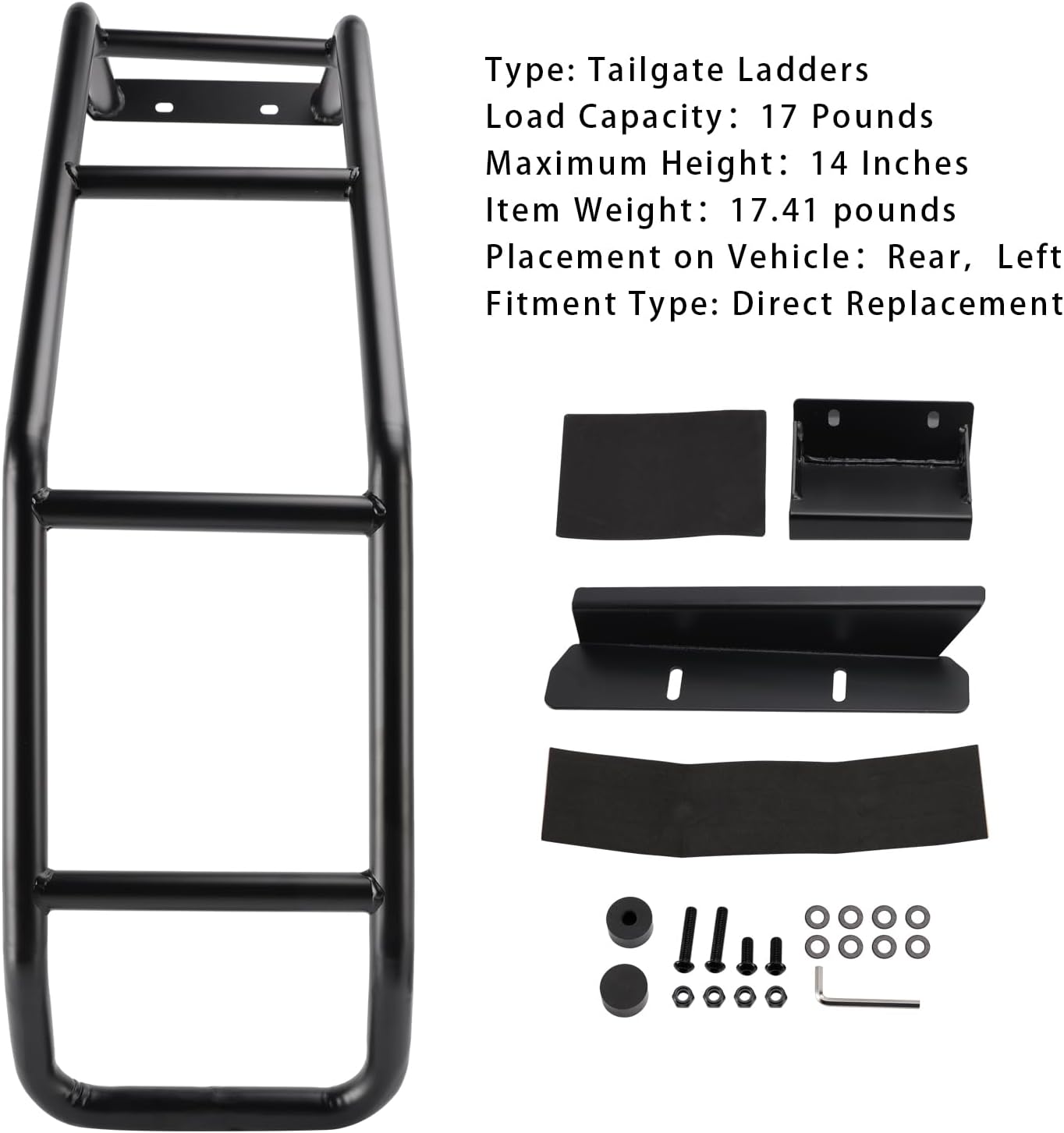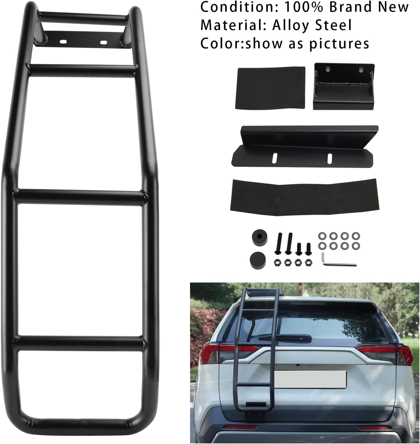 Rear Gate Ladder Kit Left Side For Toyota RAV4 2019-2024Feature:1: According to the original factory specifications,perfect match for the original car.2: Own different test machines to design exact accurate parameter for our products.All items were tested for performance.3: Made by high quality material, lightweight, anti-rust, colorfast and durable.4: Aftermarket product with premium quality.5: Stable performance, high reliability,suitable for replacing your broken one.Specifics:Condition: Brand NewMaterial: Alloy SteelColor:show as picturesManufacturer Part Number:Does not applyInterchange Part Number: Does not applyOther Part Number: Does not applyType: Tailgate LaddersLoad Capacity:17 PoundsMaximum Height:14 InchesItem Weight:17.41 poundsPlacement on Vehicle:Rear,LeftFitment Type: Direct ReplacementFitment:For Toyota RAV4 2019-2024Package Include:Ladder AssemblyMounting Hardware Kit(show as pictures)[* Instruction is not included!](Strictly Tested , High Quality Products)Note:1.Please check the description or use the year/make/model check finder and replace part numbers to confirm the compatibility before purchasing.2.Professional installation is recommended.