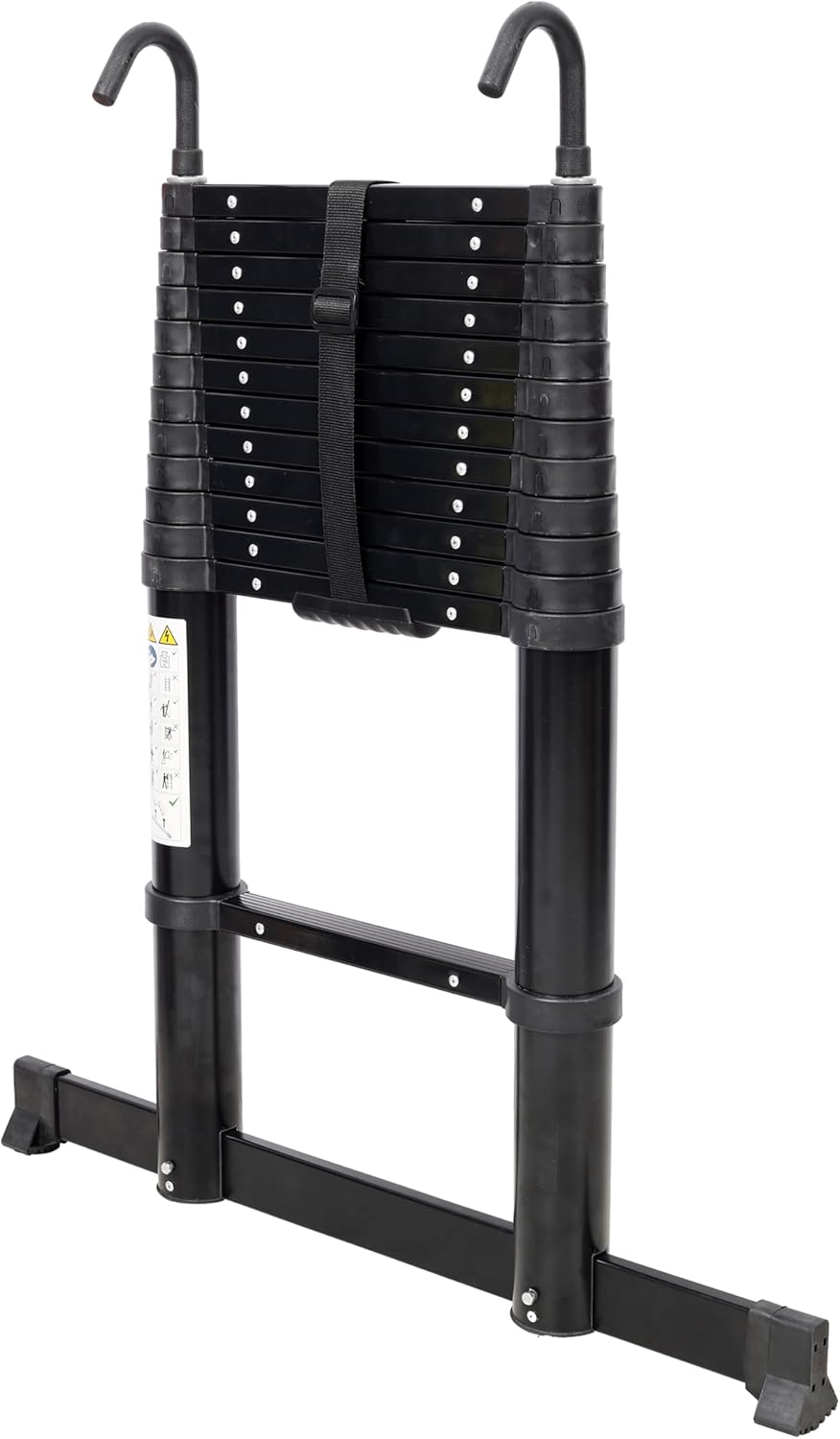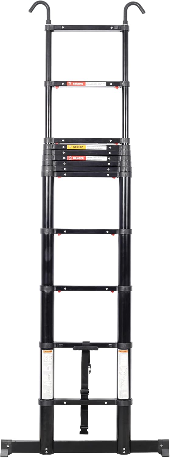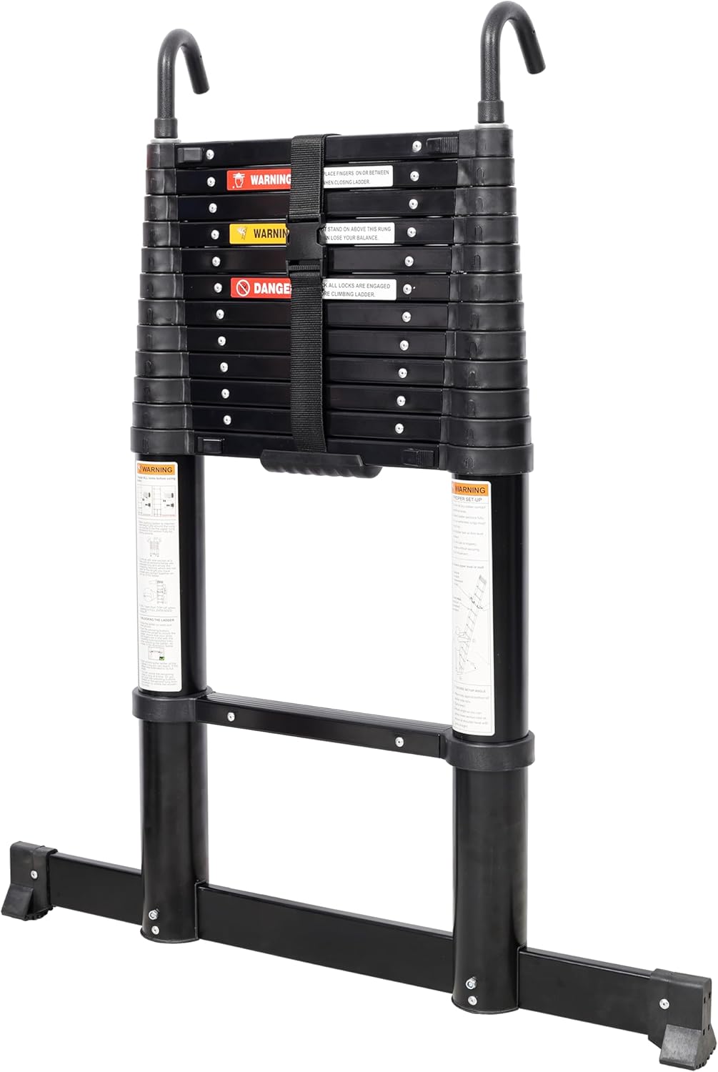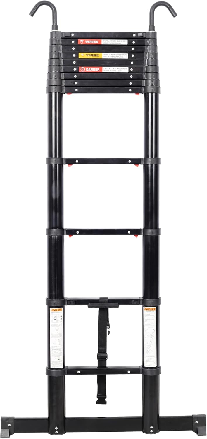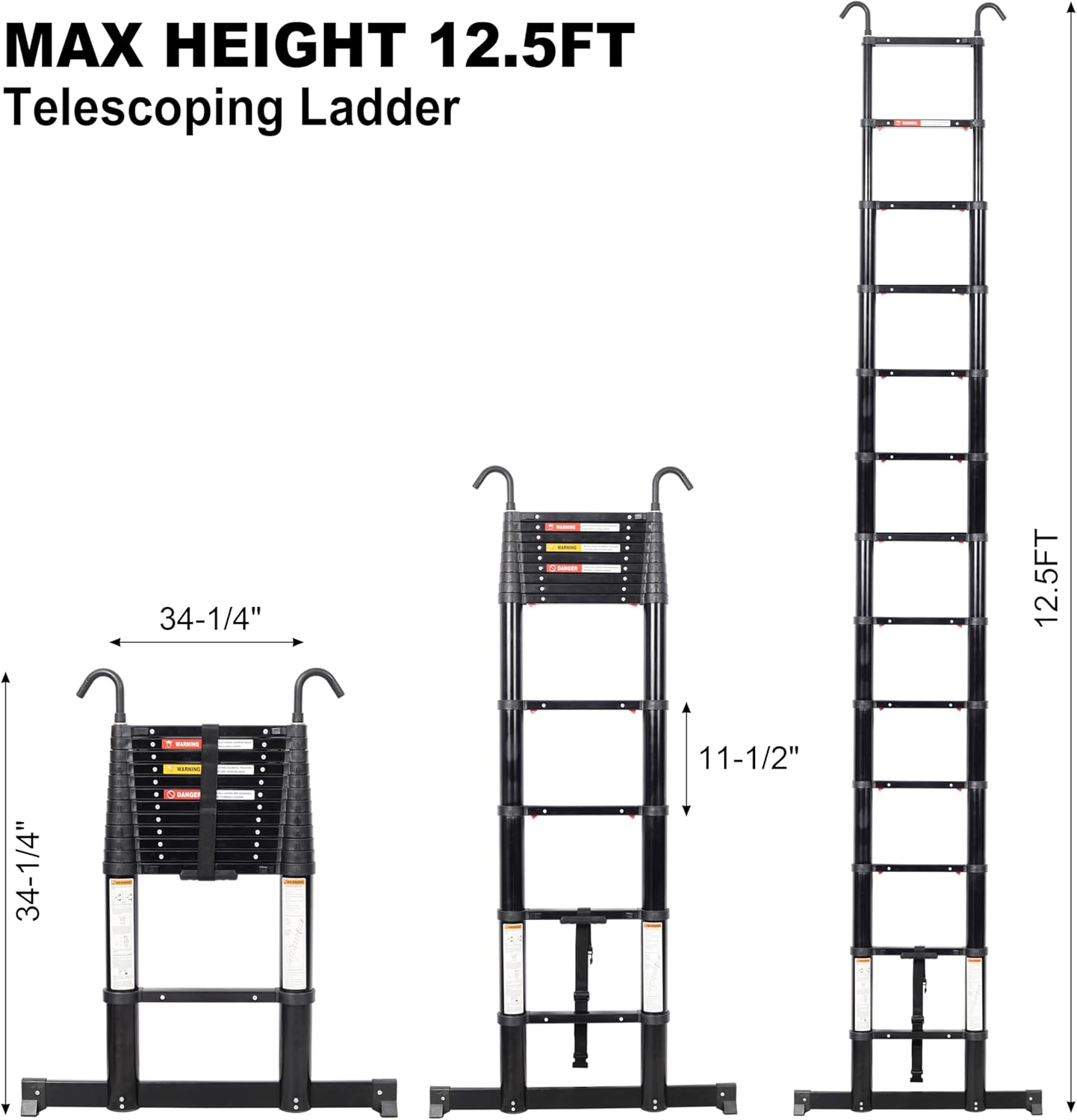 Fully safe load bearing 330 pounds, suitable for most people, independent button adjustment of each section can effectively prevent pinching hands when contracted.Max extendable length 12.5FT. Foldable size only 34"x3.5"x34.6", easy to carry. With an adjustable length ranging from 3.6FT to 12.5FT, this Aluminum telescoping ladder adapts to low and high tasks with ease.Use it for changing bulbs, painting, hanging curtains, painting walls, or repairing roofs. Its compact design when folded also makes it perfect for campers and van lifers. it's a versatile tool for professionals and DIY enthusiasts.Our folding ladder is perfect for various indoor and outdoor tasks. Ideal for home repairs, decorations, wall painting, bulb changing, roof climbing, attic access, tree pruning, gutter/window cleaning, or even as an RV ladder.