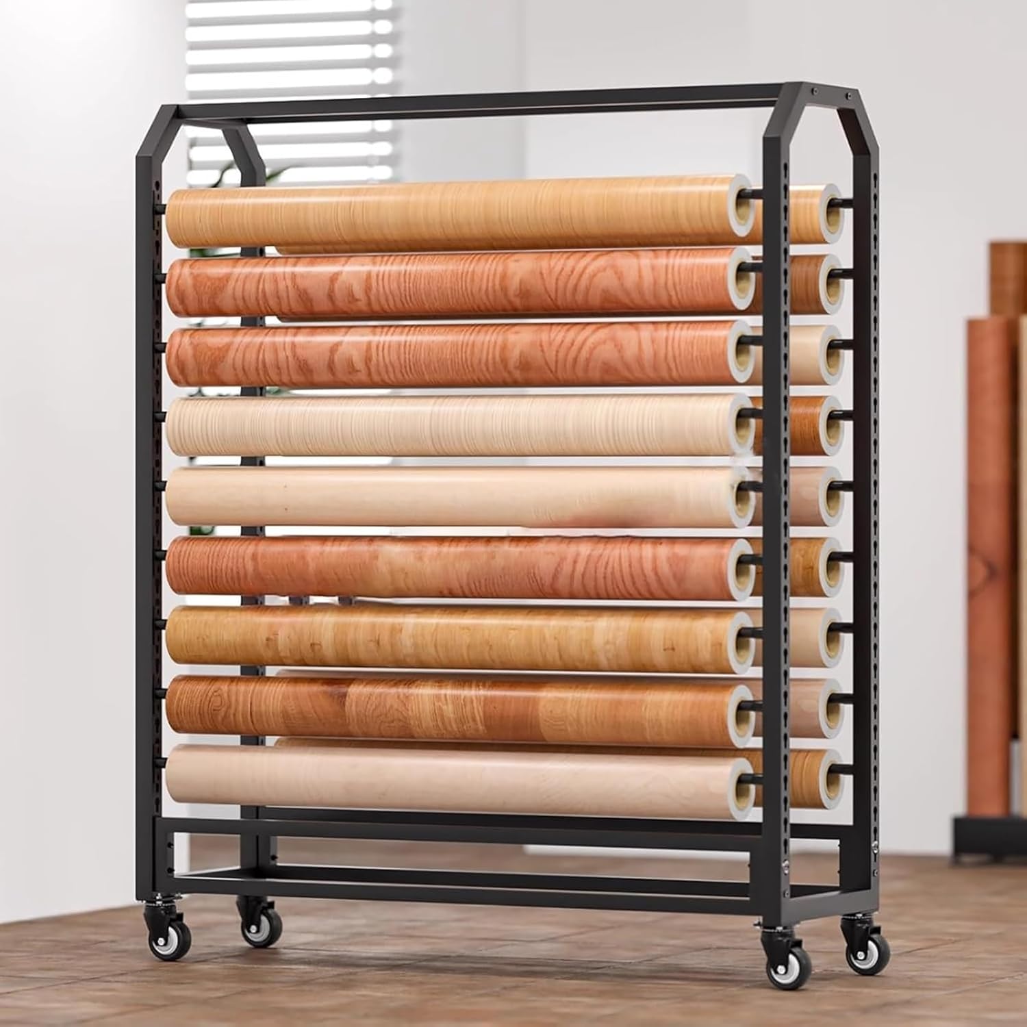 Introducing our versatile Vinyl Wrap and Fabric Roll Storage Rack, expertly designed to provide efficient organization and storage solutions for your crafting and DIY projects. This essential storage unit allows you to keep your vinyl wraps and fabric rolls neatly arranged, making it easier to access materials whenever inspiration strikes.Crafted from high-quality metal with a robust coating, our storage rack ensures long-lasting durability while maintaining a sleek black finish that complements any space. The detachable hanging rod adds convenience, allowing for easy access to your supplies and making it simple to hang and utilize items as needed. The design maximizes space efficiency, storing your materials horizontally to keep everything organized and within reach.Key Features:- **Adjustable Design**: The snap-on feature allows you to customize the spacing to fit various roll sizes, accommodating your specific storage needs.- **Compact and Efficient**: Our rack is designed to occupy minimal space while offering maximum convenience for household organization, perfect for small workshops or craft corners.- **Mobility**: Equipped with 360° rotatable wheels, this storage solution can be easily moved around, making it ideal for quick reconfigurations and ensuring your space stays clean and tidy.- **Easy Maintenance**: Simply wipe the surface with a damp cloth to keep it looking pristine and remove any dust or debris.Whether you’re setting up in a shopping mall, warehouse, or your garage, this storage rack is versatile enough for various applications, including beauty shops and craft studios. Elevate your organization game and enjoy a clutter-free environment with our Vinyl Wrap and Fabric Roll Storage Rack.
