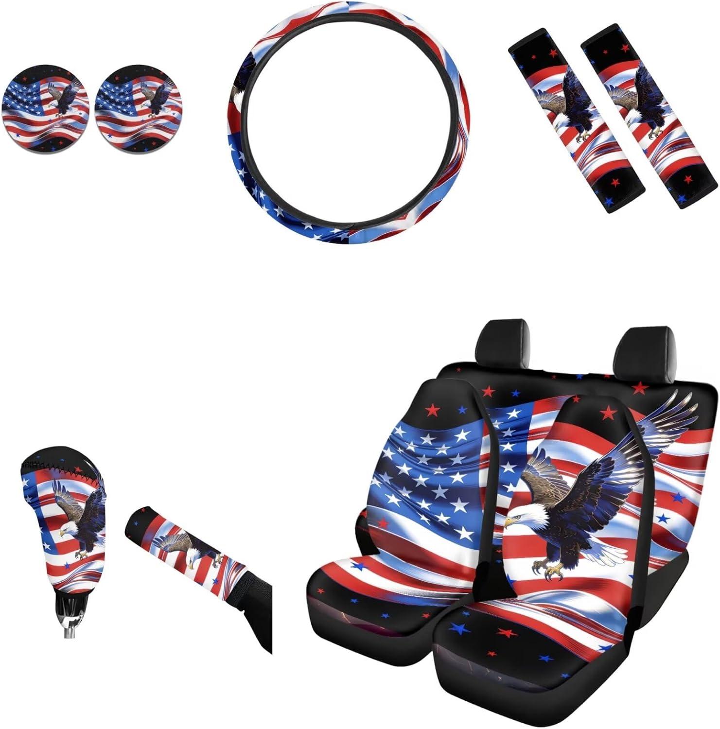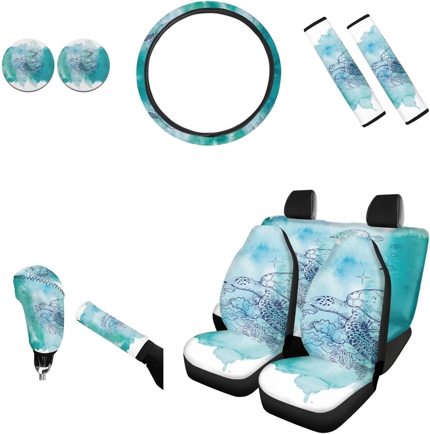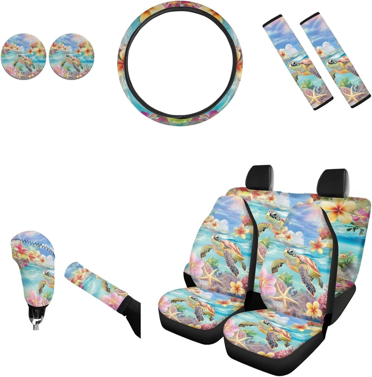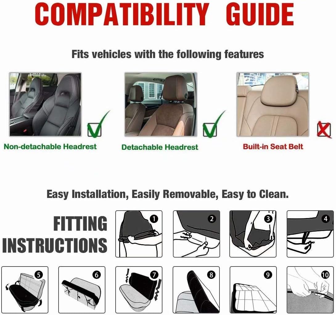 AFPANQZ Car Seat Accessories ●Package - 11 pack ●4pcs Car Seats Covers Full Set ●1pc Steering Wheel Cover ●1pc Gear Shift Knob Cover ●1pc Handbrake Cover ●2pcs Seat Belt Pads ●2pcs Car Coasters ●Car front and rear seat covers are high stretchy fit to most if cars, elastic strap with hooks on the bottom of the seat covers. ●Steering wheel covers are stretchable to fit standard 14-15 "diameter steering wheels. Keep dry, non-slip, protect your hands from steering wheel burn by summer and cold in winter. ●Shoulder seat belt pads designed with premium velcro, can be adjusted in width and perfectly adjusted. Protect your neck and shoulders when driving. Can also be used on backpacks and luggage bags. ●Gear Shift Knob and Handbrake Covers are anti-skid, soft, Sweat-absorbent. Bring a new look for your car, also can protect car interior accessories from ultraviolet oxidation, rust, dust, wear and scratches. ●Car Coasters diameter is 2.75", can easily absorb water outside the cup. When water or drinks escape from the cups, the car coaster absorbs all the moisture in your cup and keeps your car's cup holder clean. We are constantly developing new products and often listing new products on our Amazon store, welcome to add us to your list. All the production in our store can do customized printing, a good choice for personalized gift or wholesale. If there are any problems before or after your order, please feel free to contact us, we will reply to you within 24 hours and give you the best solution.