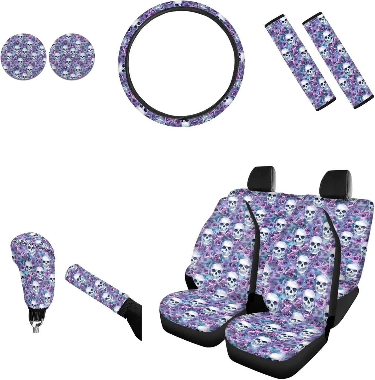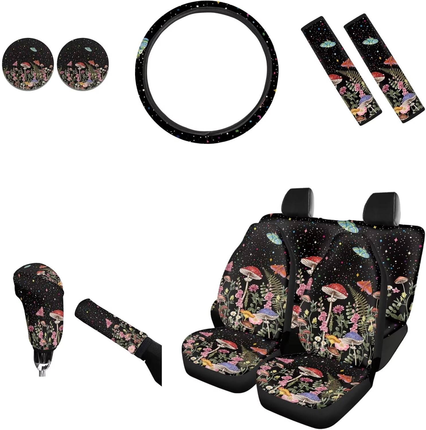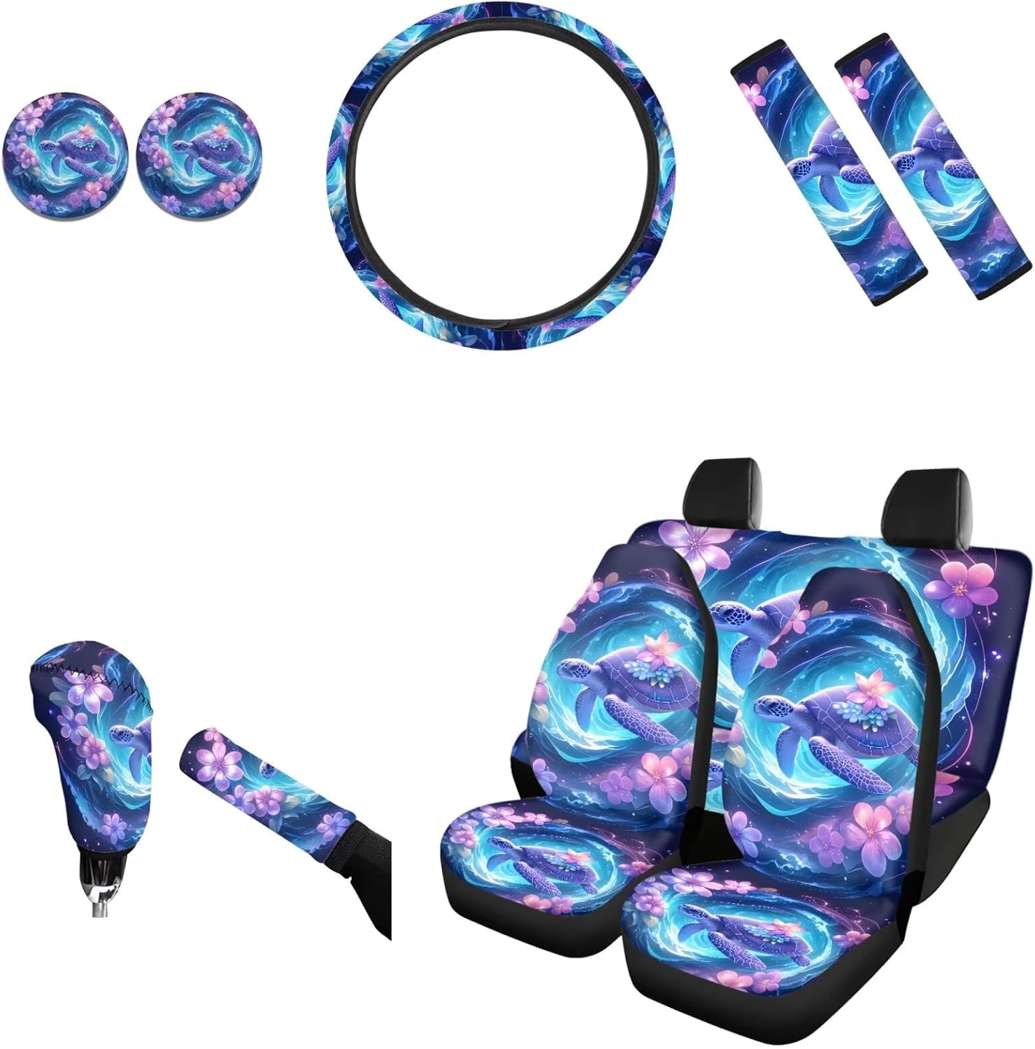 AFPANQZ Car Seat Accessories ●Package - 11 pack ●4pcs Car Seats Covers Full Set ●1pc Steering Wheel Cover ●1pc Gear Shift Knob Cover ●1pc Handbrake Cover ●2pcs Seat Belt Pads ●2pcs Car Coasters ●Car front and rear seat covers are high stretchy fit to most if cars, elastic strap with hooks on the bottom of the seat covers. ●Steering wheel covers are stretchable to fit standard 14-15 "diameter steering wheels. Keep dry, non-slip, protect your hands from steering wheel burn by summer and cold in winter. ●Shoulder seat belt pads designed with premium velcro, can be adjusted in width and perfectly adjusted. Protect your neck and shoulders when driving. Can also be used on backpacks and luggage bags. ●Gear Shift Knob and Handbrake Covers are anti-skid, soft, Sweat-absorbent. Bring a new look for your car, also can protect car interior accessories from ultraviolet oxidation, rust, dust, wear and scratches. ●Car Coasters diameter is 2.75", can easily absorb water outside the cup. When water or drinks escape from the cups, the car coaster absorbs all the moisture in your cup and keeps your car's cup holder clean. We are constantly developing new products and often listing new products on our Amazon store, welcome to add us to your list. All the production in our store can do customized printing, a good choice for personalized gift or wholesale. If there are any problems before or after your order, please feel free to contact us, we will reply to you within 24 hours and give you the best solution.