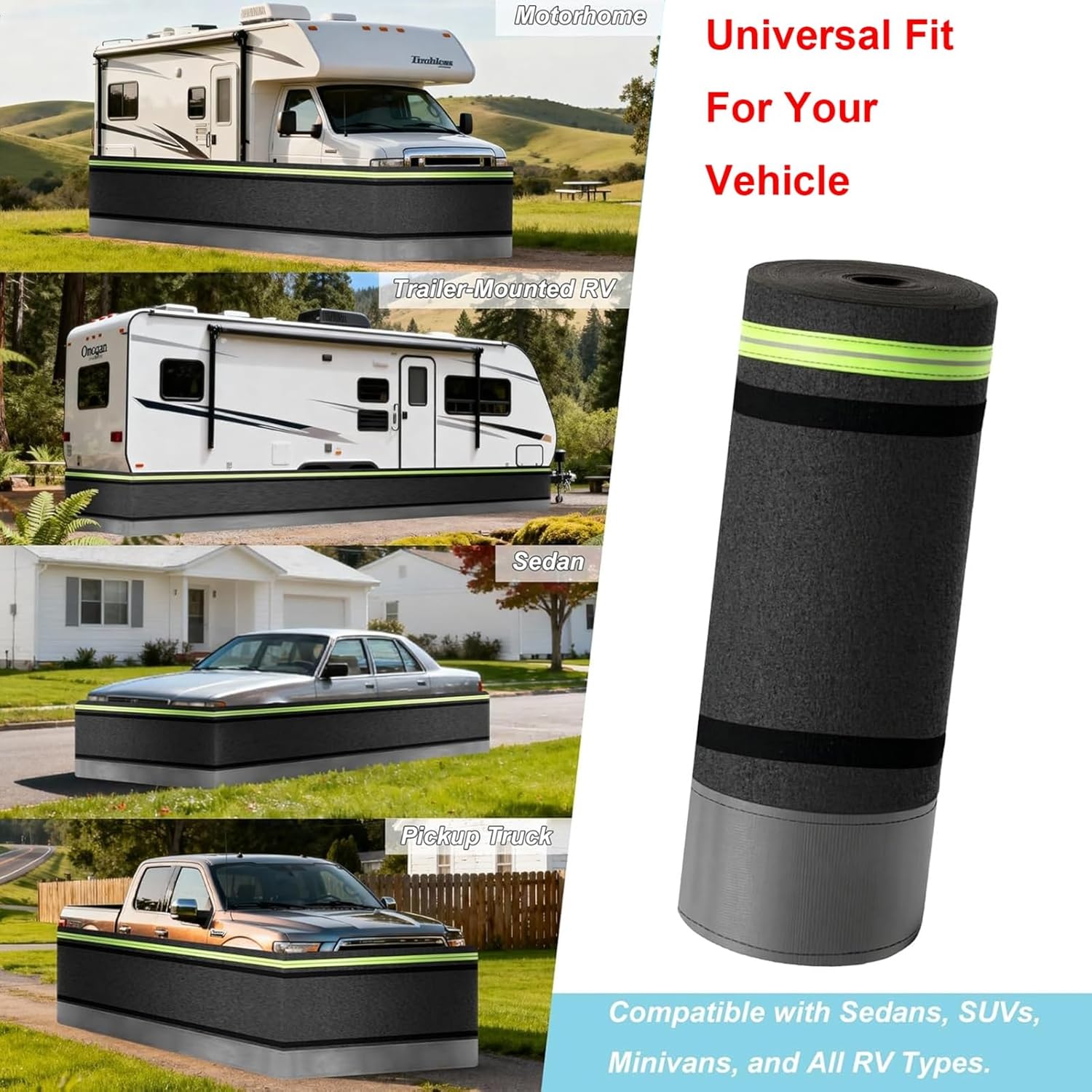 RV Skirting for WinterRV skirting can completely fit the car body, which can protect the underside of the car body from scratches and corrosion, and prolong the service life of your car. In rainy days, the Rv skirt can also reduce the splash of mud and water on the body to keep the vehicle clean.Size SelectionVersatile Heights: Available in multiple heights - 2.6 ft, 3 ft, and 3.3 ft - to suit different RV styles and preferences.Flexible Length Options: Choose from a variety of lengths including 36 ft, 39 ft, 43 ft, 46 ft, 49 ft, 52 ft, 59 ft, 65 ft, 72 ft, 78 ft, 85 ft, 92 ft, 98 ft, 105 ft, 111 ft, 118 ft, and 124 ft for a perfect fit for your vehicle.Weather Resistant: Designed for all seasons, our RV skirting provides exceptional protection against snow, frost, rain, sun damage, and water intrusion.Before ordering a camper skirting, please measure the circumference of your RV. Note that this is not a single side length.DIY cuttingDIY Travel Trailer Skirting CutYou may freely trim the travel trailer Skirt to your desired length or adjust the seam placement to better serve the purpose of the camper skirting.Rainproof, Snowproof, Windproof, and Sun-ProtectiveRainproof, Snowproof, Windproof, and Sun-ProtectiveThe mobile home skirting is thickened and encrypted fiber felt with waterproof function, which can provide effective protection for your vehicle even in rainy and snowy weather.Rv SkirtRV skirts protect your vehicle from damage while parked.Reflective StripHigh-visibility reflective strips reflect ambient light at night, alerting pedestrians and drivers.Combination LockUpgraded combination lock simplifies installation and removal while preventing loss of protective wheel rv Cover.Package Includes: 1 x RV SkirtingNote on Sizing: All measurements are hand-measured, and actual dimensions may vary slightly upon delivery.Color Disclaimer: Due to differences in lighting and monitor calibration, actual product colors may vary. We appreciate your understanding.Customer Support: If you have any questions or concerns regarding our product or your order, please reach out to us via email. We are committed to assisting you and will respond within 24 hours.