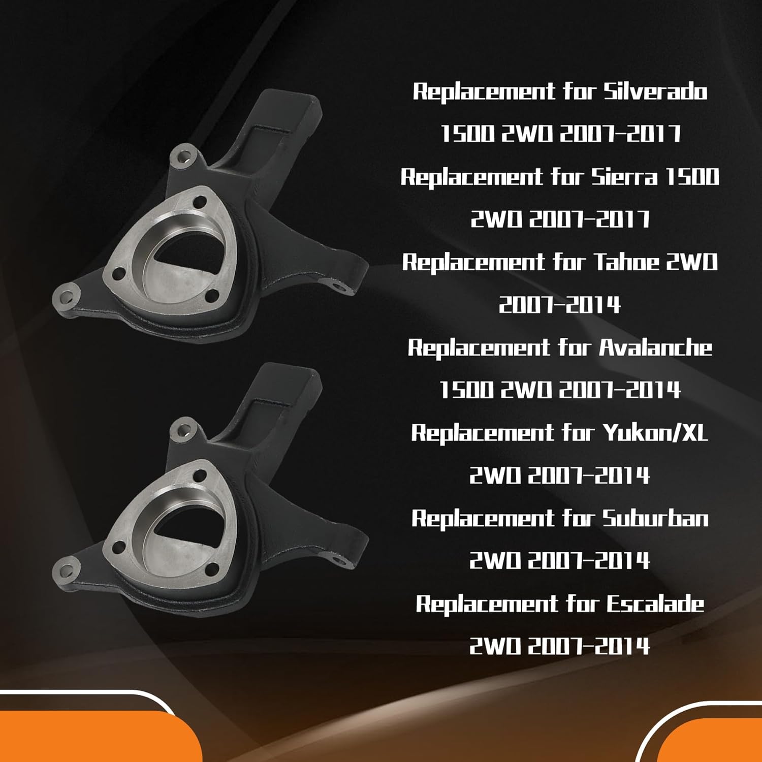4.5" Lift Spindles KnucklesFitment: Replacement for Silverado 1500 2WD 2007-2017Replacement for Sierra 1500 2WD 2007-2017Replacement for Tahoe 2WD 2007-2014Replacement for Avalanche 1500 2WD 2007-2014Replacement for Yukon/XL 2WD 2007-2014Replacement for Suburban 2WD 2007-2014Replacement for Escalade 2WD 2007-2014Part Number:M0117K43-1 M0117K43-2Package Included:2Pcs 4.5" Lift Spindles KnucklesInstallation:Professional installation is strongly recommendedNote:Please confirm your model and part number before purchasing