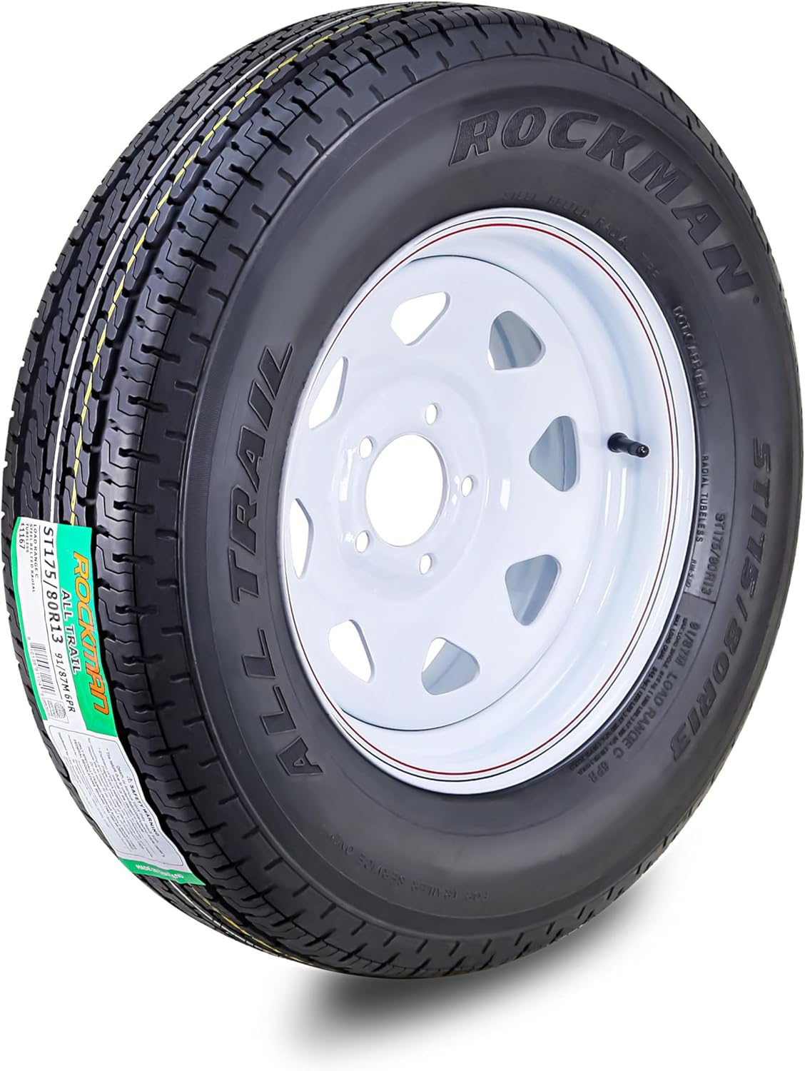 SAFETY--FULL nylon cap ply overlay cross entire tread area, significant upgrade from most other products on the market have nylon strips on shoulder area only, add critical safety feature!. LONG LASTING: 8mm deep tread depth vs 5.6 mm of other cheap competitors, durable and longer mileage life. PERFORMANCE: 8 ply rated, load range D. Load Index:107. Speed rating M--up to 81mph. WHEEL DETAIL: 5 Lug on 4.5" bolt pattern, offset: 0, style: White Spoke. SAFETY CERTIFIED: Meets or exceeds applicable DOT standards to provide dependable performance season after season for hauling cargo safely.Tire SpecificationsTire Size: ST205/75R15Brand: ROCKMANTread Pattern: All TrailPly Rated: 8Tread Depth: 8Rim Width: 5Max Load: 2150lbsLoad Index: 107Speed Rating: MPlease note: fitment guide is for reference only and does not guarantee the tire will fit your specific model. Please check your owner's manual to ensure proper fitment.