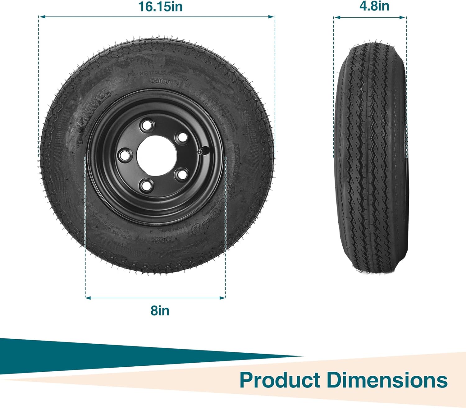2-Pack High Load Trailer Tire On RimHighlights at a Glance:- Tire size: 4.80-12/4.80-8 with 6-ply construction- Load Range C for heavy-duty towing- Max load capacity: 990 lb/760 lb at 90 PSI- Speed rating M for safe highway speeds- Sturdy rim with 5 lug nut holes- Nylon cord bias ply design for strong sidewalls- Ideal for family camping, boat & utility trailers- Easy assembly and reliable all-weather performanceSpecification:4.80-8 6PR 5-LugSpeed Rating: M | Load Index: 80 | Max PSI: 90 | Max Load: 345 kg (760 lb) | Section Width (SW): 129 mm | Rim Size: 8x3.75 inches | Bolt Pattern (PCD): 5 on 4.5" (114.3 mm)4.80-12 6PR 5-LugSpeed Rating: M | Load Index: 80 | Max PSI: 90 | Max Load: 450 kg (990 lb) | Section Width (SW): 120 mm | Rim Size: 12x4 inches | Bolt Pattern (PCD): 5 on 4.5" (114.3 mm)Packing List:2 x Trailer Tire Wheel Assembly1 x User ManualFriendly Note:Each tire has its size clearly marked on the sidewall, providing important information about the tire. Please verify your original tire size before making a purchase to ensure proper fit and compatibility.