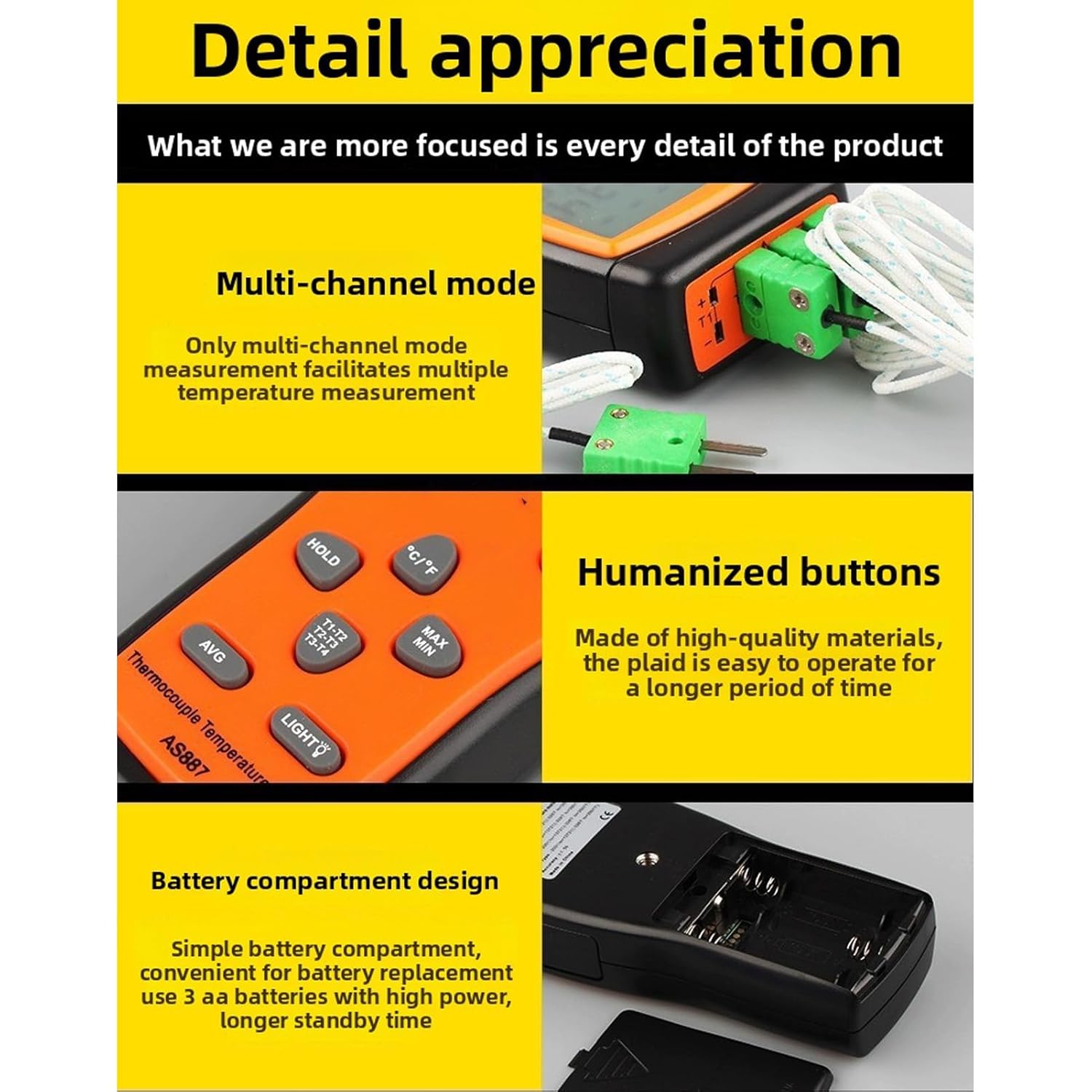 Specification Item Type: 4 Channels Thermometer Product Material: ABS, Silicone Rubber Battery: 3 x AA Battery (not included) Measurement Range: -200-1372℃ (-328-2501℉) Resolution: ±0.1% ( Accuracy: ±(reading x 0.5% + 1.5)℃ Voltage Parameter Package List 1 x Thermocouple Thermometer 4 x Probes 1 x Storage Bag 1 x User Manual