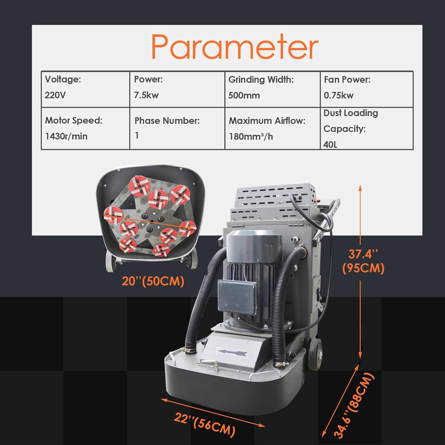 Parameter:Grinding Width: 500mmMotor Speed: 1430r/minVoltage: 220VPower: 7.5kwPhase Number:1Fan Power: 0.75kwMaximum Airflow: 180mm³/hDust Loading Capacity: 40LPrecautions for use:1.The input voltage should not be too low.2.When using, first lift the machine head off the ground, and then turn on the switch. When the machine head rotates normally, gently place it on the ground.3.When working, the machine head swings left and right, then moves forward, and cannot stop in place.4.In case of power failure during operation, the switch should be reset and cannot be stopped at the original position to avoid burning the motor when the power is on.Note:Give away 5 meters of wires. The maximum length of the wire connected to the machine can be 90 meters. The specification is three-core wires. Each wire should not be less than 6 mm² of pure copper wire. The wire must be connected to the air switch, and the rated current of the air switch is about 63A. As shown in the picture of wiring mode, please contact us if you have any questions.