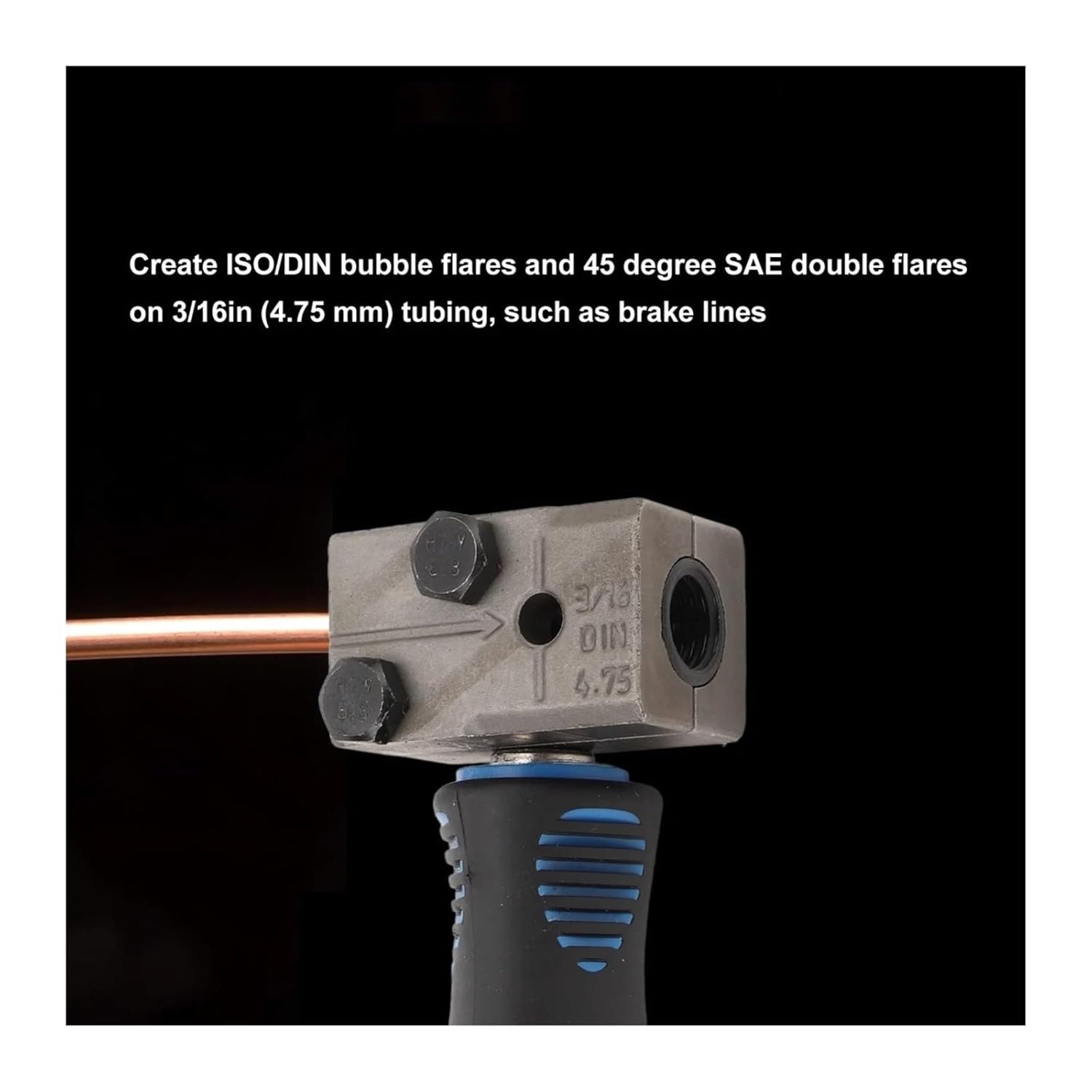 Get the job done in half the time: this compact and portable Double Flaring Tool lets you easily create 45-degree DIN double flares on 3/16 in. tubing such as brake linesWorks flawlessly with 3/16 in. steel, nickel, and copper tubingCompact design lets you create perfect double flares both off vehicle and on vehicle, even in tight spotsDetachable die lets you also use with a bench viseAll-in-one tool. All you need is a 10 mm and a 17 mm wrench to work with the toolThe Double Flaring Tool lets you create perfect 45-degree SAE double flares in half the time compared to old generation flaring tools. Its compact and portable design lets you work both off vehicle and on vehicle, even in tight spots. The die can be detached so you can also work with a bench vise for more grip. The tool works flawlessly with 3/16 in. steel, nickel, and copper tubing. This is an all-in-one tool. A 10 mm and a 17 mm wrenches are the only other tools you need to start making double flares.This repair tool is carefully forged from chrome vanadium steel, with a tough and durable texture, like a loyal and reliable partner, silently accompanying you through the long years of repair. It has a wide range of uses, like a master key, and can handle complex repairs of cars and trucks, as well as fine maintenance of motorcycles and bicycles with ease. With it, your different repair needs can be accurately met, and many difficult repair problems can be easily resolved, allowing your car to regain its former beautiful appearance,
