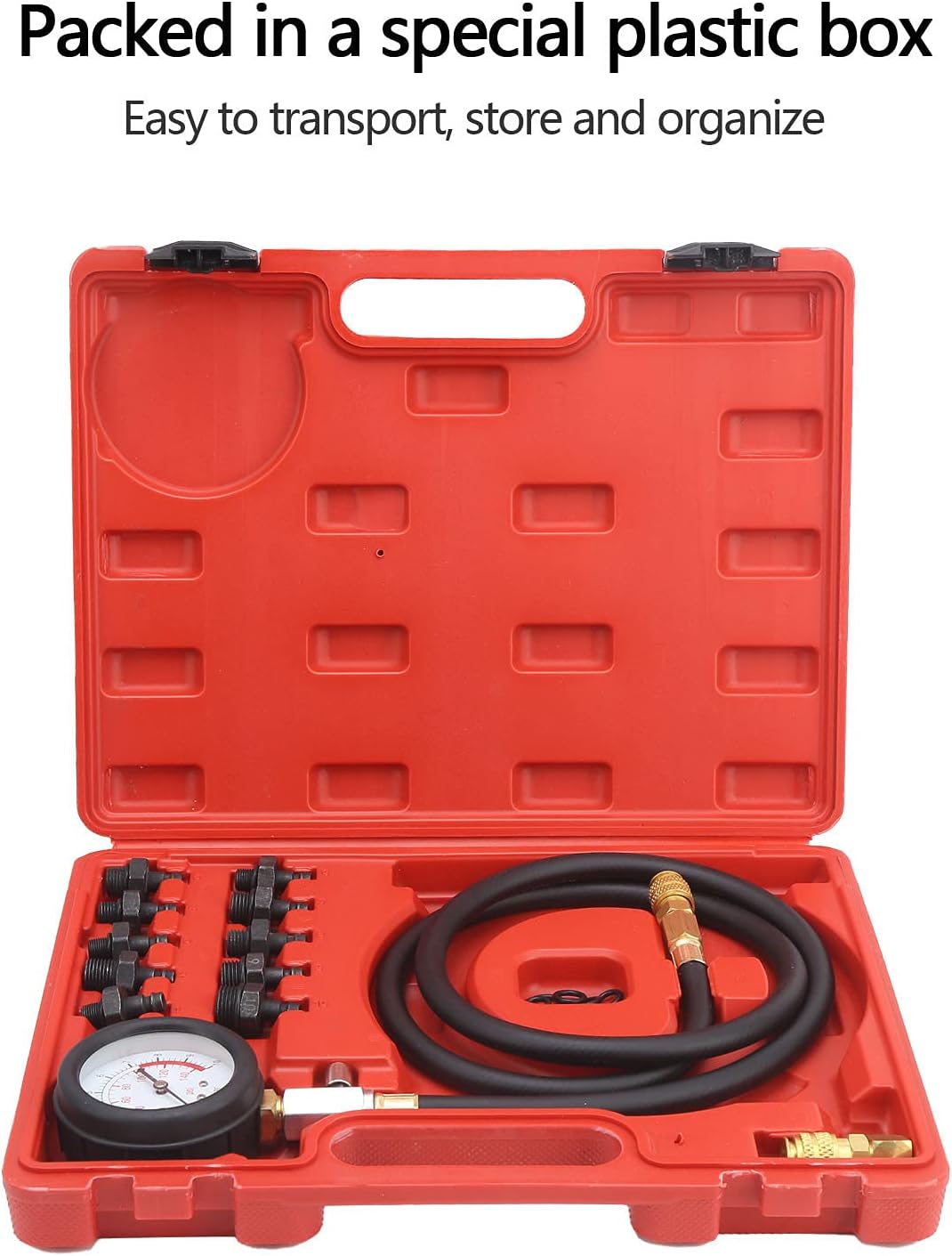 Item Type: Engine Oil Pressure Test Tool KitMaterial: Stainless Steel+RubberSpecification:Adapter R 1/8in 2999Adapter 1/8in x 27 NPTAdapter 1/4in x 18 NPTAdapter 3/8in x 20 UNFAdapter 1/2in x 20 UNFAdapter M10Adapter M12Adapter M14Adapter M16Adapter M18L: 90° ElbowPackage List:1 x Oil Pressure Test Tool Kit (12pcs)1 x Toolbox1 x Manual9 x Rubber Ring