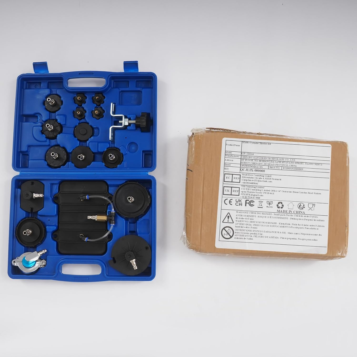 DescriptionOur brake fluid pressure bleeder adapter kit has excellent sealing performance. It includes complete accessories and can improve work efficiency and reduce labor intensity. The product is of outstanding quality, exquisite workmanship, robustness, and durability, making it a versatile tool for professionals and enthusiasts alike.ApplicationThis tool kit is suitable for Nissan, Honda, Chrysler, Dodge, Ford, Jeep, Toyota, Lexus, BMW, Audi, and more. It is widely used in auto repair shops, auto sales and service shops, private car DIY, etc. SpecificationsColor: Blue, BlackStyle: ModernMaterial: PlasticApplicable Models: For Nissan, Honda, Chrysler, Dodge, Ford, Jeep, Toyota, Lexus, BMW, Audi, and moreNumber of Adapters: 12Toolbox Size: 47*28cm/18.5*11.02inAdapters Size: 29mm/1.14in, 33.5 mm/1.32in, 34.5mm/1.36in, 42mm/1.65in, 43mm/1.69in, 43.5mm/1.71in, 49.5mm/1.95in, 50.7mm/2in, 56mm/2.2in, 74mm/2.91inRectangular Adapter Size: 19*12.7cm/7.48*5in Package Size: 45*38*10cm/17.72*14.96*3.94in Gross Weight: 2kg/4.41lbsNet Weight: 1.2kg/2.65lbsPackage Included12* Adapters1* Adapter Joint4* J-shaped Bolts2* Chains1* Toolbox All Accessories for UseNotes1. Please double-check compatibility before purchasing. 2. Please pay attention to safety during the operation. 3. Please put it back in its original position after use to prevent loss. 4. Please always wear gloves (not included) when doing automotive maintenance. 5. Please allow the slight color difference caused by the shooting light and 1-3cm error due to manual measurement and make sure you do not mind before ordering.