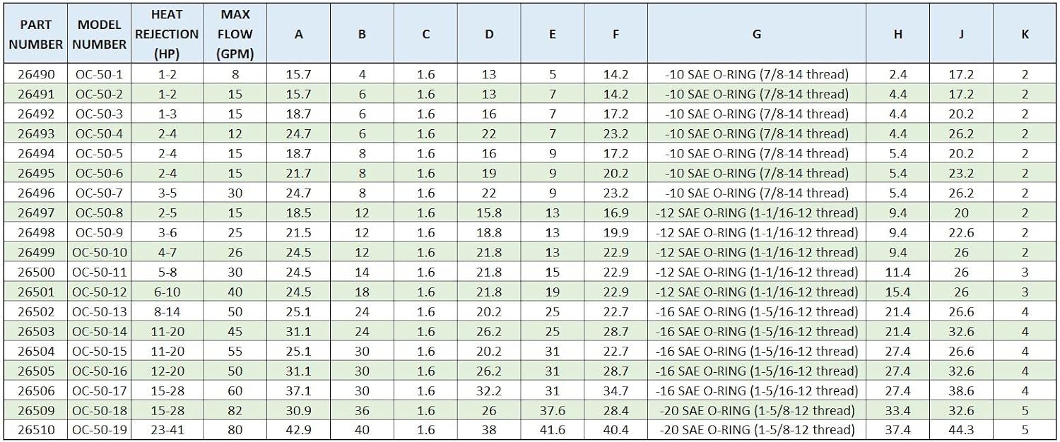 Universal Mount Bar and Plate Oil Cooler OC-50-3 18.7” x 6” x 1.6” SEE SIZING CHART FOR ADDITIONAL SIZE OPTIONS INSTALLATION SHOULD BE PERFORMED BY TRAINED PROFESSIONAL! ASSEMBLY NEEDS TO BE INSTALLED ON THE LOW-PRESSURE SIDE OF THE OIL CIRCUIT PART NUMBER: 26492 MODEL NUMBER: OC-50-3 CORE (FINNED AREA) DIMENSIONS: 16” x 6” x 1.6” OVERALL DIMENSIONS: 18.7” x 7” x 1.6” INLET / OUTLET PORT: -10 SAE O-RING (7/8-14 thread) FLOW RATING: 1-15 GPM HEAT REJECTION: 1-3 HP (2,545-7,635 BTU/HR) MAX WORKING PRESSURE: 300 PSI MAX OPERATING TEMPERATURE: 350⁰F Cross Reference Part Numbers: DH-073-2-1, 9-12370-073, 016004