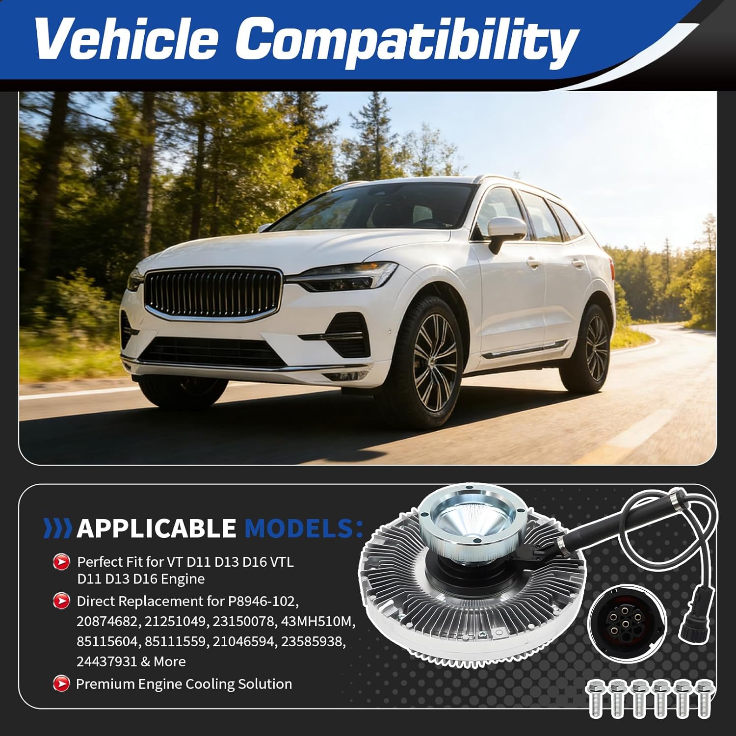 Interchange Part Number:2358593885115604851115592104659424437931Applicable Models:The cooling fan clutch is compatible with VT D11 D13 D16, compatible with VTL D11 D13 D16 engines, not compatible with D16H enginesPackage Included:1 × Cooling Fan ClutchThe cooling radiator fan clutch can effectively achieve precise control, noise reduction, emission reduction, improve the performance of your car, enhance power and fuel economy, and help extend the use time of the product.