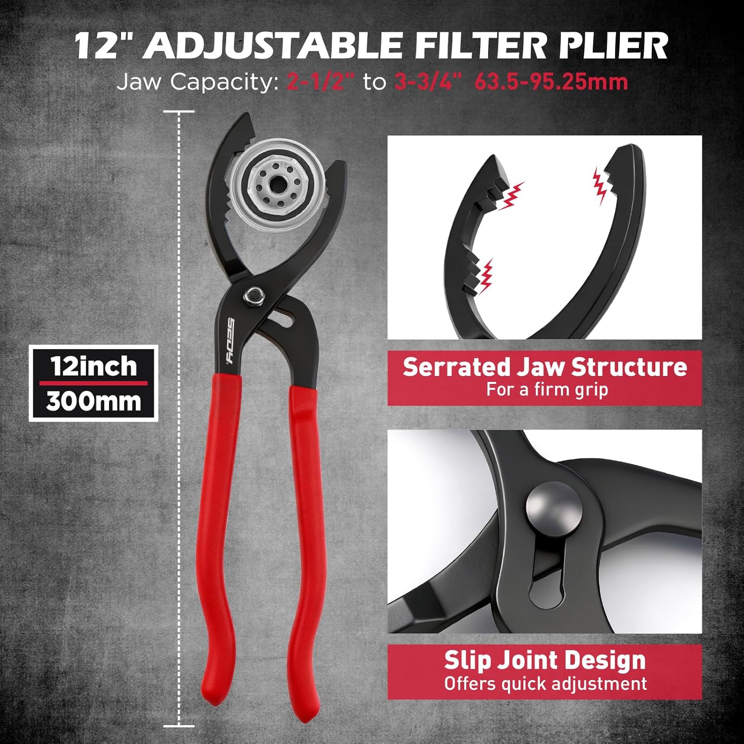 | Included Components | 5PCS Oil Filter Swivel Wrenches + 1PC 12-Inch Adjustable Oil Filter Plier + 1PC 1/2"-3/8" Adapter + 1PC 1/2"Quick Release Ratchet Handle + 1PC Universal 3-Jaw Oil Filter Wrench + 1PC Towel |