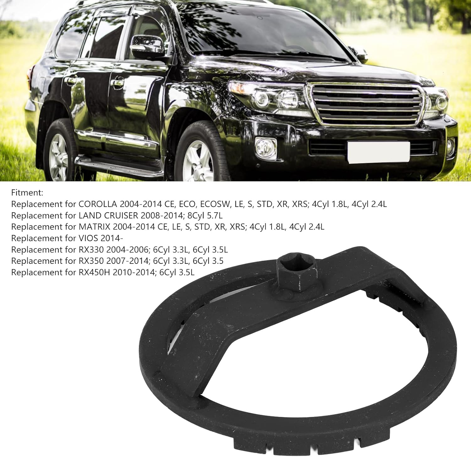 Item Type: Fuel Tank Lid RemoverMaterial: MetalColor: BlackFitment: Replacement for COROLLA 2004-2014 CE, ECO, ECOSW, LE, S, STD, XR, XRS; 4Cyl 1.8L, 4Cyl 2.4L Replacement for LAND CRUISER 2008-2014; 8Cyl 5.7LReplacement for MATRIX 2004-2014 CE, LE, S, STD, XR, XRS; 4Cyl 1.8L, 4Cyl 2.4LReplacement for TACOMA 2005-2014; 4Cyl 2.7L, 6Cyl 4.0LReplacement for YARIS S 2007-2011; 1.5L L4Replacement for YARIS BASE 2007-2011; 1.5L L4Replacement for VIOS 2014-Replacement for RX330 2004-2006; 6Cyl 3.3L, 6Cyl 3.5LReplacement for RX350 2007-2014; 6Cyl 3.3L, 6Cyl 3.5Replacement for RX450H 2010-2014; 6Cyl 3.5LPackage List:1 xFuel Tank Lid Remover