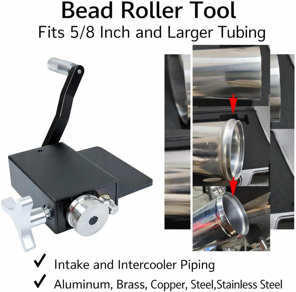 Take your fabrication work to the next level with this heavy-duty Bead Roller Tool, designed to fit 5/8 inch and larger tubing with ease. Whether you're working on intake piping, intercooler piping, or custom tube fabrication, this manual tube beader delivers clean, precise beads every time. Compatible with a wide range of materials including aluminum, brass, copper, steel, and stainless steel, this versatile tool is a must-have for any serious fabricator or automotive enthusiast. The tool measures 6.3 inches in length and 5.4 inches in width, with a 6-inch handle arm and a 2.5-inch knurled grip handle for comfortable, controlled operation. The main roller measures 1.6 inches in diameter, while the secondary roller comes in at 0.4 inches, ensuring a consistent and accurate bead roll. The sturdy black-finished body is built to withstand demanding workshop conditions, while the ergonomic crank handle makes operation smooth and effortless. Ideal for both professional shops and home garages, this bead roller tool is the reliable solution for creating secure, leak-resistant connections in your tubing projects.