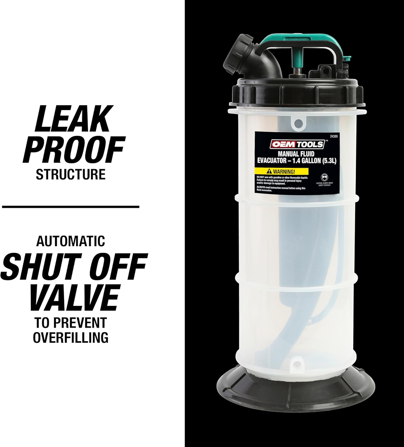 The OEMTOOLS 24389 Manual oil change pump – 1.4 Gallons (5.3L) is built for fast, clean fluid removal from cars, trucks, motorcycles, marine engines, and industrial equipment. This fluid extractor automotive uses a manual hand pump—no air or power required—to draw engine oil, coolant, transmission fluid, gear oil, or water through dipstick tubes and other access points. It includes a 41" dipstick hose adapter for hard-to-reach areas and a leak-proof, single-piece reservoir to minimize mess. The integrated fluid transfer pump overflow shutoff valve prevents spills by stopping suction once capacity is reached. Ideal for shops, garages, or DIY maintenance, this oil vacuum pump extractor helps you extract fluids with control and ease. Use this oil pump extractor for boats, cars, or motorcycles when changing fluids or flushing systems. Always dispose of fluids responsibly according to local, state, and federal regulations. This tool is a must-have for clean, efficient fluid changes.