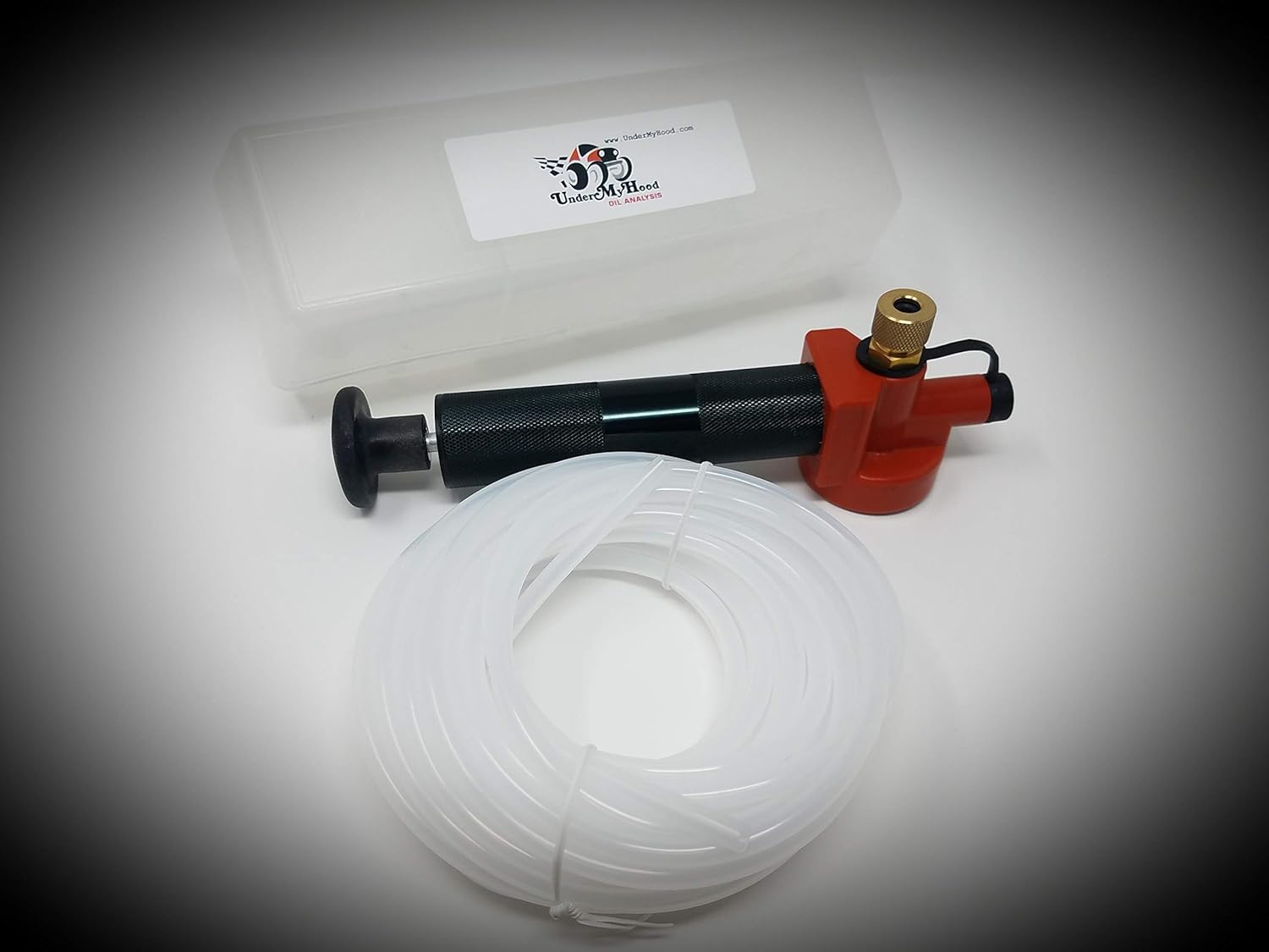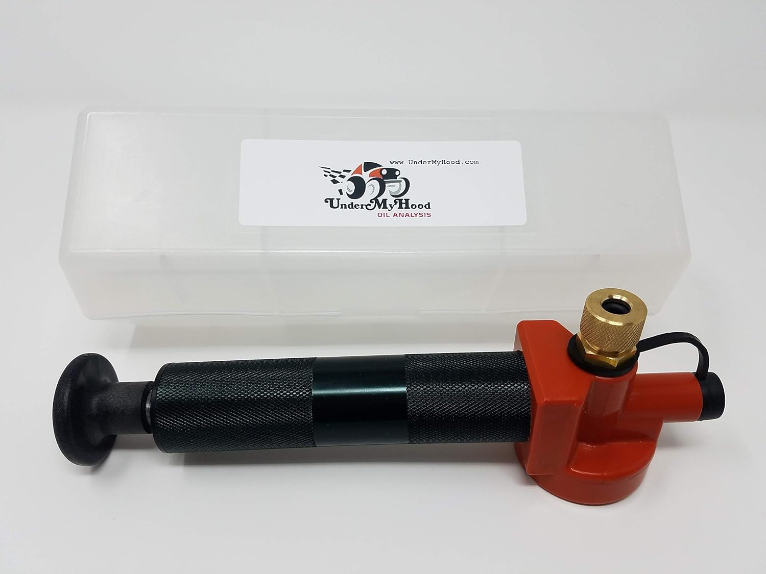 Oil analysis is a fast and inexpensive way to determine the health of your equipment. Spotting problems as they are beginning to develop allows these issues to be addressed before you have a breakdown. This Oil Analysis sample pump is used for extracting used oil from engines, transmissions, differentials and more. Includes 25' of tubing to be used in the dipstick to draw the used oil for the sample or you may pull the sample when changing the oil. Use with standard 38mm bottles and standard tubing sizes 3/16" - 5/16". Purchase an Under My Hood Oil Analysis sample kit to collect the sample and have it analyzed at our lab for quick results sent directly to your email.