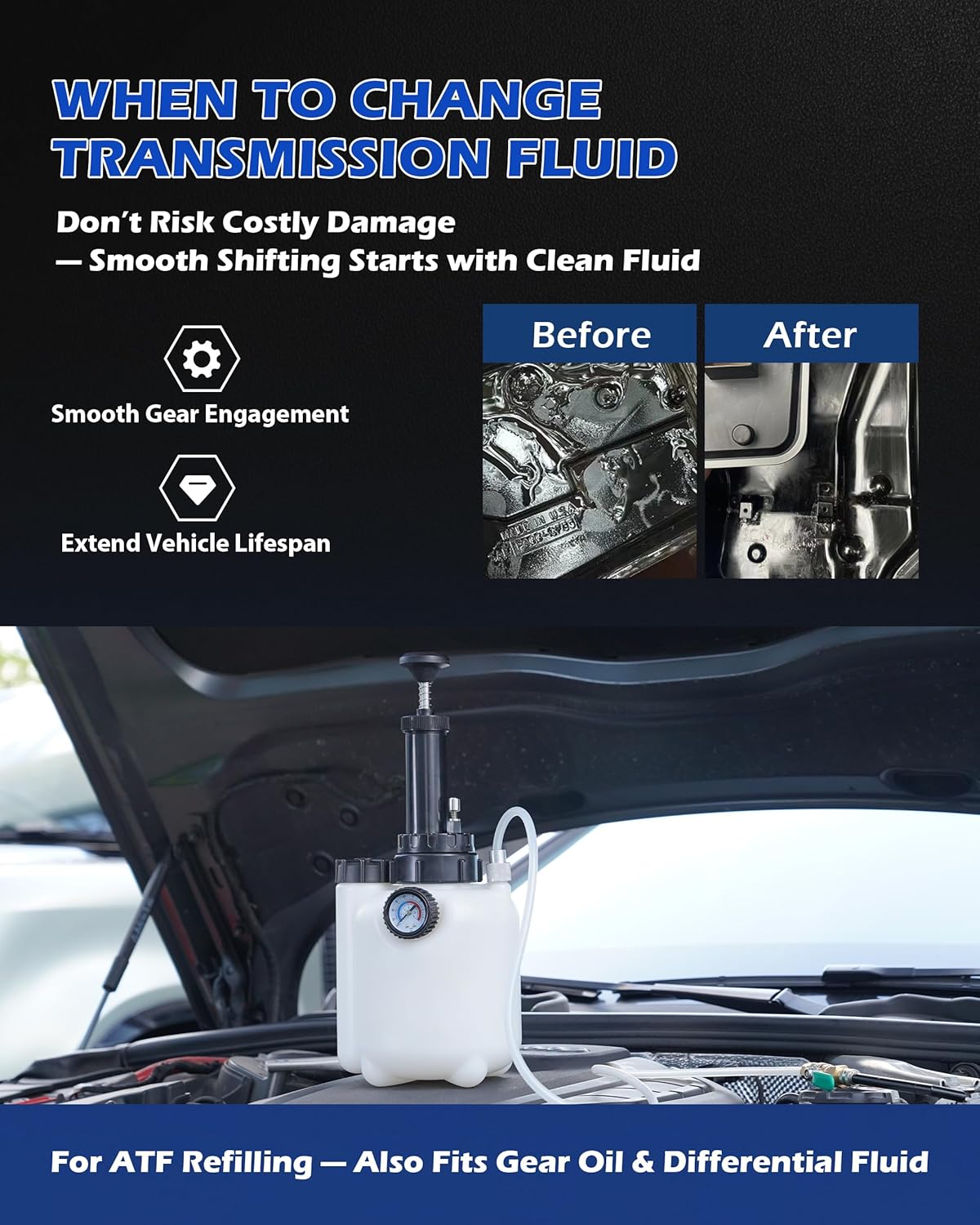 Take the mess out of drivetrain maintenance with this 3L Manual Fluid Transfer Pump. Designed for precision and ease, it features an integrated pressure gauge that allows you to monitor and control fluid delivery in real-time, preventing overfills and wasted oil. This comprehensive kit includes 12 precision ATF adapters, ensuring wide compatibility across major brands. Whether you are servicing an automatic or manual the reinforced, corrosion-resistant reservoir and leak-proof seals provide a reliable, high-pressure solution for transferring transmission fluid, gear oil, and differential fluid. Compact and lightweight, it is the perfect tool for both professional mechanics and DIYers looking for a clean, efficient, and fast refill every time.