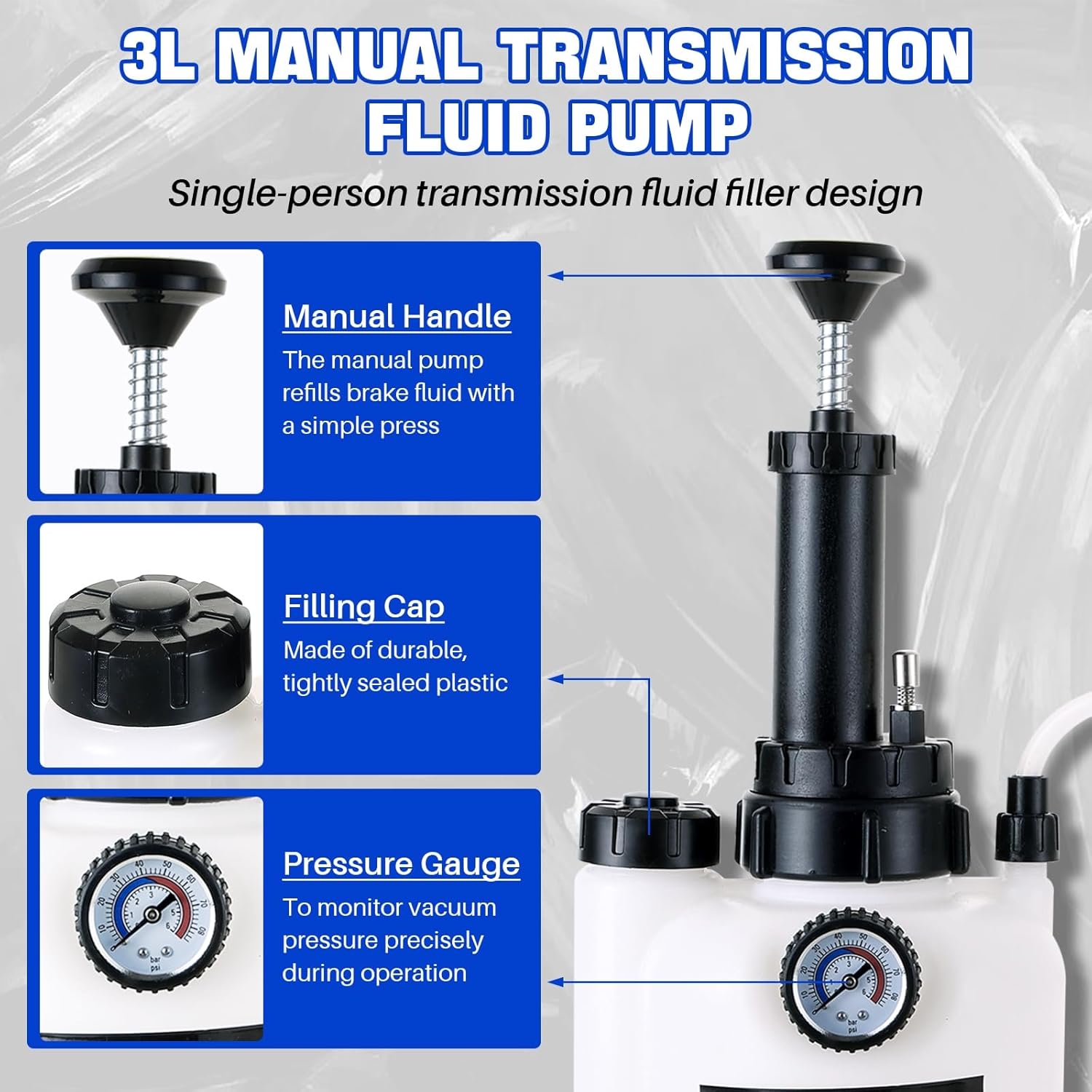 • Universal Compatibility: The fluid filling pump includes a durable 3L container, ergonomic pump handle, pressure gauge, release cap, tube, and 8 ATF adapters compatible with Ford, BMW, Nissan, Audi, and more.The oil transfer pump set is designed for various automotive fluids, including ATF, brake fluid, and power steering fluid,etc.
