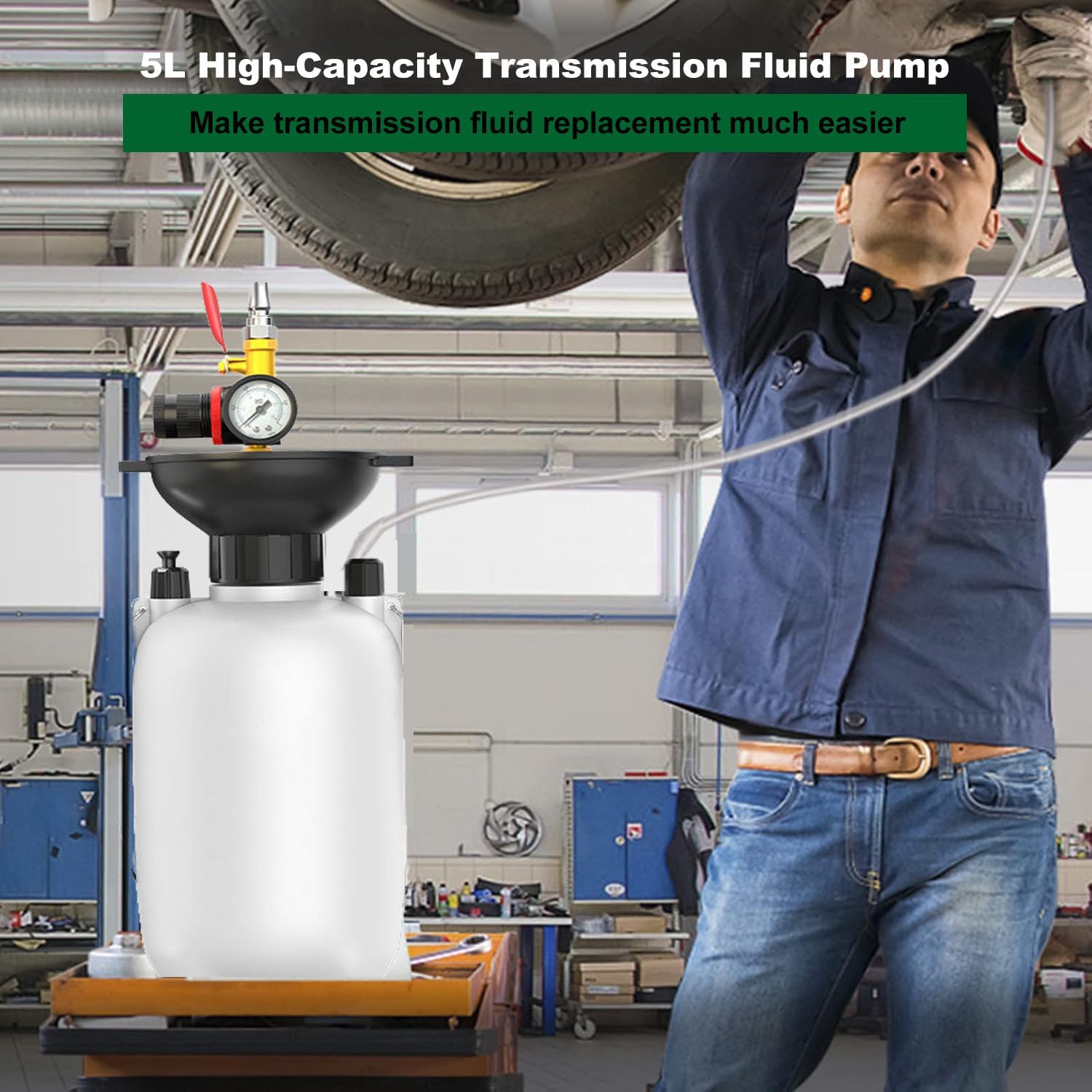 Transmission Fluid PumpEasy DispensingWith our Transmission Fluid Pump's open funnel design, pouring oil becomes convenient and . The thickened kettle body is built to withstand pressure and ensures easy oil refilling.Optimal Pressure ManagementEquipped with an internal pressure gauge and safety valve, our Transmission Fluid Pump ensures efficient and safe fluid transfer.Easy DispensingWith our Transmission Fluid Pump's open funnel design, pouring oil becomes convenient and . The thickened kettle body is built to withstand pressure and ensures easy oil refilling.This Oil and Liquid Extractor features a thickened kettle body for durability and easy control of pressure. The innovative press-back lock allows for even more precise pressure control. The air inlet valve is conveniently located for easy access, while the flexible hose can be bent and fixed for maximum convenience during use.Specification:Item type: Transmission Fluid PumpOil pot capacity: 5LProduct features: With safety valverange: 0-1MPaPacking List:Pneumatic Transmission Fluid Transfer PumpX1ATF Adapters X5Pressure gaugeX1Pressure regulating valve X1Raw material belt X1HoseX1joint tube X1Clamp X2Intake valve X2