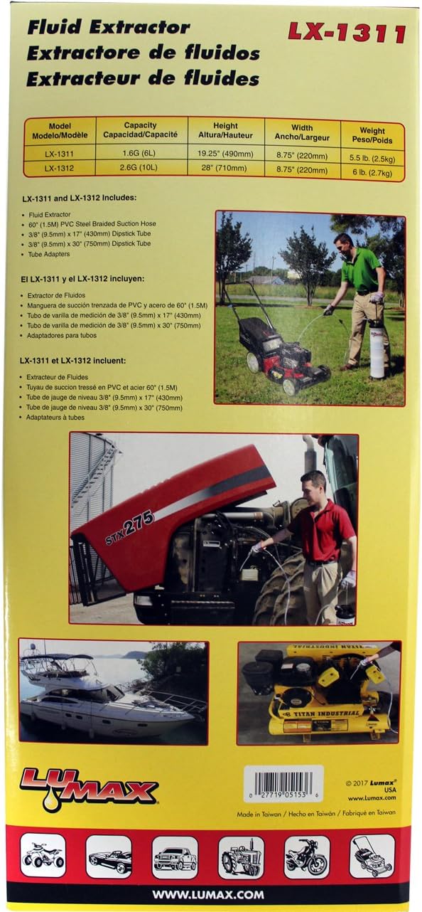 Handy transfer pump to move fluids through dipstick tubes and filler ports. Vacuum is created quickly and efficiently by manual pump operation, offering superior mobility without the need for electricity. Manual Fluid Extractor, 1. 6G (6L) Capacity, Easy to Operate Manual Pump Operation. Ideal Suitable for Brake Fluid, Engine Oil, Gear Oil, Transmission Fluid, Water, etc. Ideal for Extracting or Changing Engine Oils or Lubricants in ATV's, Boats, Farm Equipment, Industrial Gear Boxes, Motor Vehicles, Motor Bikes, RV's, Small Aircraft Engines, Snowmobiles, Watercrafts, etc. Excellent for use with Oil, Coolant and Hydraulic Systems Durable, Oil and Chemical-Resistant Polypropylene Construction. Automatic Overflow Prevention. Non-Spark. Non-Power Fluid Extractor. Avoids Mess and Minimizes Clean-Up. Lumax's mission is to provide professionals and consumers with innovative and high-quality products to get the job done right. Product development at Lumax goes beyond the physical product, to a deeper understanding of the end-users' needs. Engineered with the "user-in-mind, " Lumax products are built to the highest standards and incorporate many unique features that make work easier, faster and cost-effective. We have a passion for the design process. We listen to our customers and their ever-expanding requirements. Our unique products lead the field in design, quality, and performance.