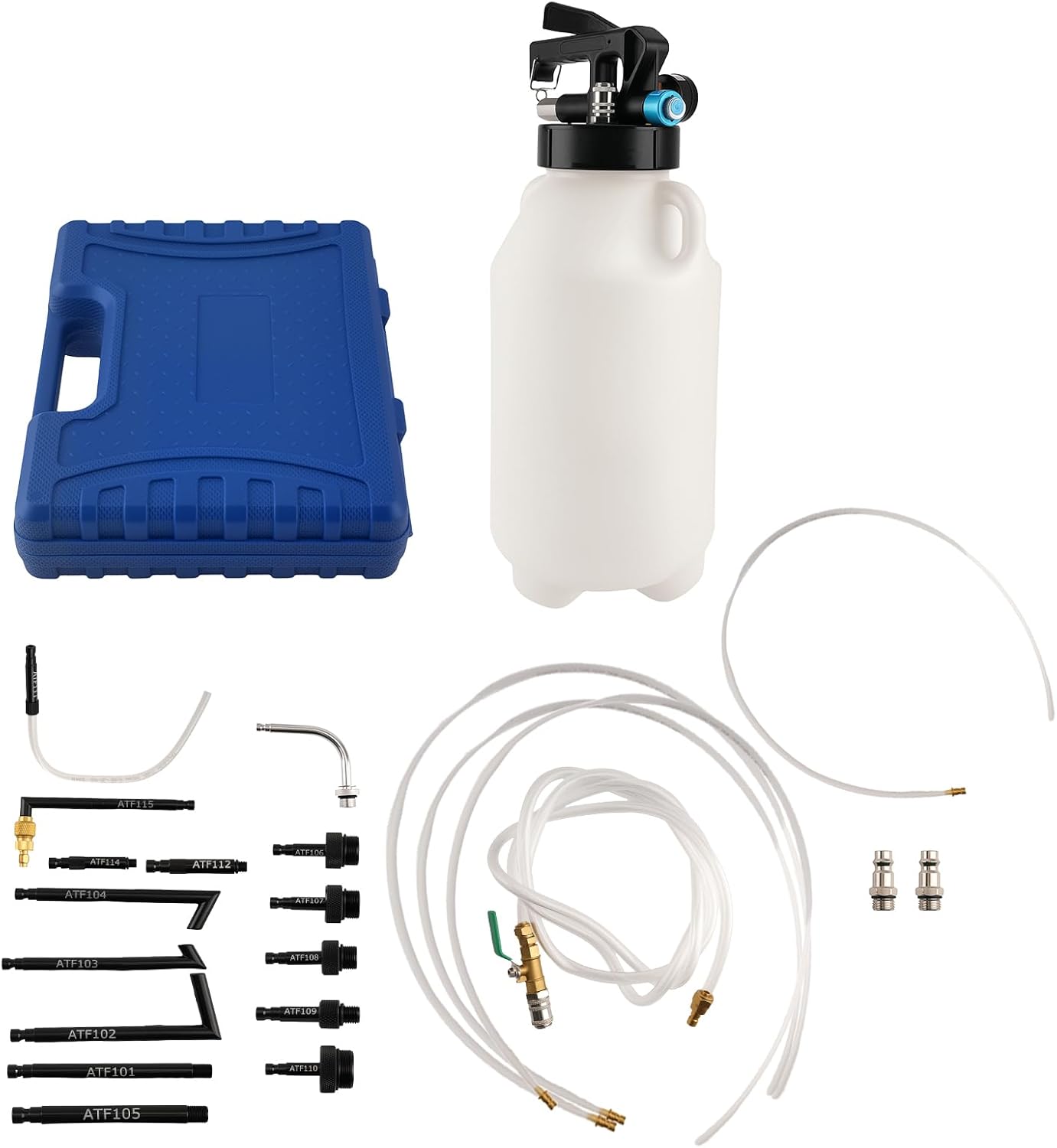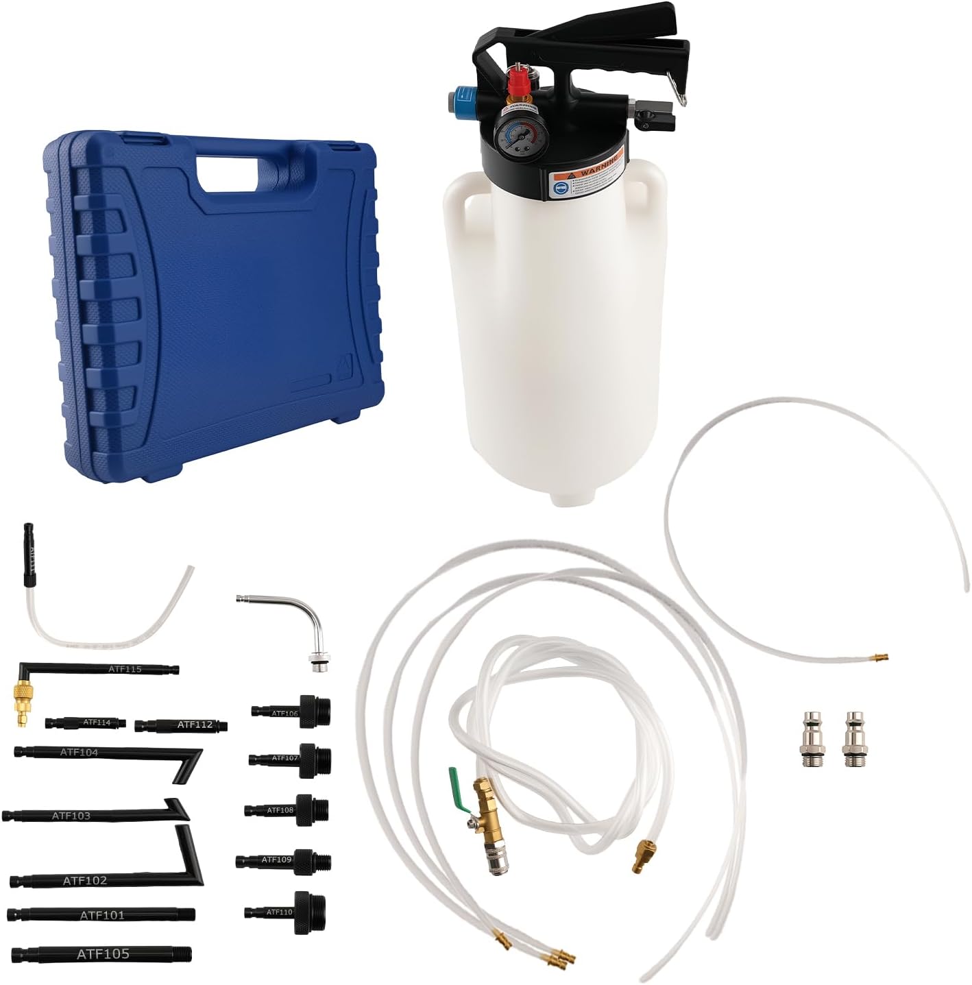 ApplicationATF101: for Ford ATF102: for BMW, Honda, Nissan ATF103: for Audi, Skoda, VolkswagenATF104: Audi, Porsche, Volkswagen ATF105: for Audi, Mini, Volkswagen ATF106: for Audi, Volkswagen-DSG ATF107: for Audi, Volkswagen CVT ATF108: for Skoda, Volkswagen ATF109: for Mercedes-Benz, Toyota ATF110: for Audi, Skoda, Volkswagen ATF111: for Honda, Hyundai, Kia ATF112: for Volvo ATF113: for Lexus, Toyota ATF114: for Infiniti, Nissan ATF115: for VolkswagenSpecificationCondition: New Material: PE Tank Capacity: 2.6 gal. (10.6 qt. or 10 L) Air Port Diameter: 1/4 in. (6.35 mm) Extraction Pressure: 40-170 psi (2.8-12 Bars) Max. Dispense Pressure: 43 psi (3 Bars) Hose Lengths: 28.7, 39.4, 59 in. (73, 100, 150 cm)Package included1 x Brake Fluid Bleeder 3 x Tubes 15 x Adapters 1 x Blow-Molded Case