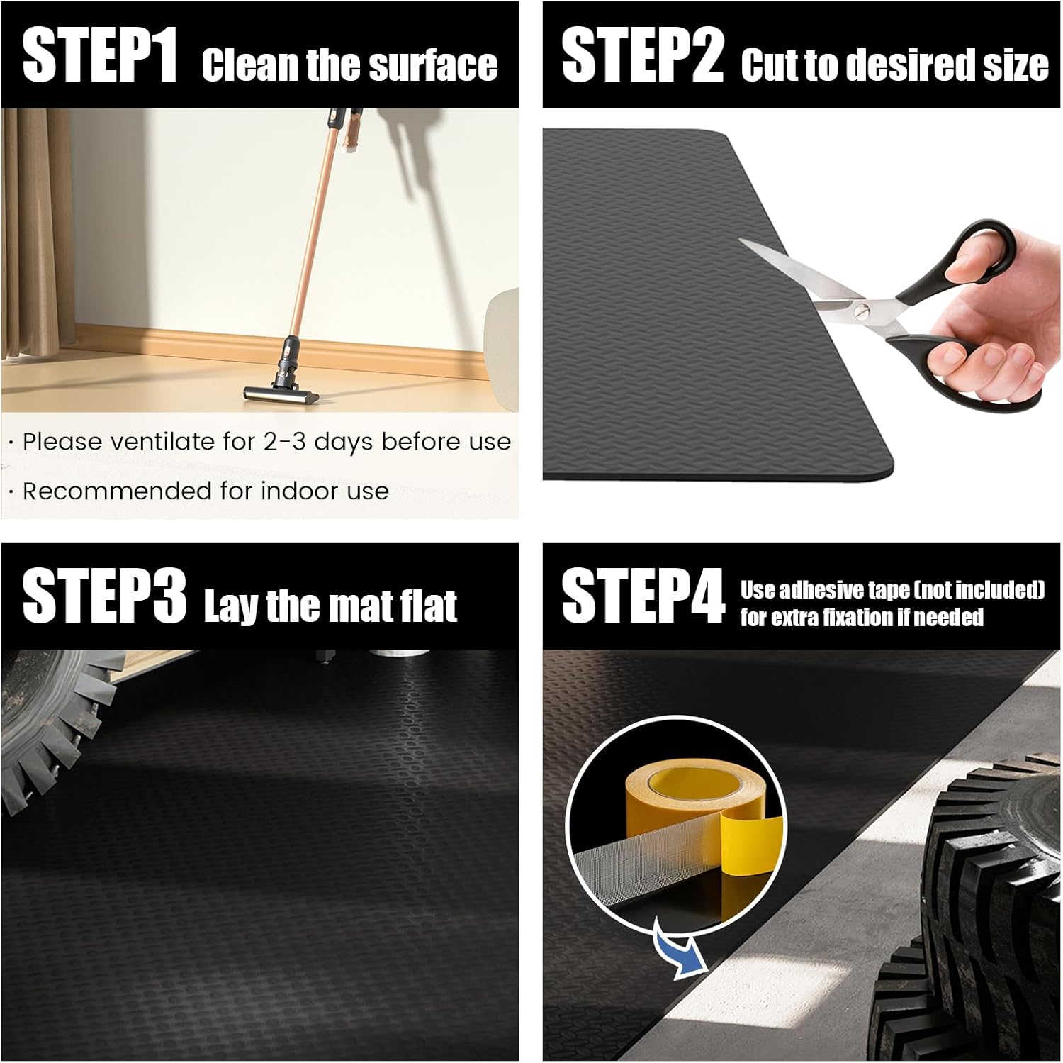 Description:Elevate your garage with our Premium Heavy-Duty Garage Floor Mat Set—tough, versatile, and easy to use. This 4-pack includes four 7.7x3.8ft mats, combinable into a 15.5x7.7ft full-coverage mat, and cuttable for a custom fit.Featuring 0.3-inch thick and superior water resistance, it blocks spills, rain, mud, and leaks to keep floors pristine, even in harsh weather. Made of durable PE with a 3D diamond texture, it boosts traction to prevent slips and reinforces structural strength.Install in seconds: just roll out, or secure with tape (not included). Clean effortlessly with soap, a hose, and air-dry. Perfect for homes and businesses—ideal for cars, SUVs, golf carts, motorcycles, and use under tools, appliances, in warehouses, or gyms. A smart, low-hassle upgrade.Features:Shield floors from rain, mud, snow, and leaks effectivelyComes 4-pack with each mat 7.7x3.8ft; combines to 15.5x7.7ft for full coverage.Cuttable design allows customization to fit specific garage or parking space needs.Made of durable PE material that enhances longevity for long-term use.3D diamond texture improves traction, preventing slips for tires and shoes.Raised surface patterns reinforce the mat’s structure for added durability.Easy to install: simply roll out; can be secured with tape (not included).Hassle-free cleaning: wash with soap, hose off, and air-dry quickly.Suitable for various vehicles: cars, SUVs, pickup trucks, golf carts, and motorcycles.Versatile for home and commercial use, including garages, trailers, and warehouses.Ideal for placing under appliances, tools, and garbage cans for protection.Note: Please ventilate for 2-3 days before useSpecification:Color: BlackMaterial: PEOverall Dimensions of 4 Rolls: 15.5 x 7.7 ft(L x W)Dimensions of Each Mat: 7.7 x 3.8 ft(L x W)Thickness: 0.3”/7 mmNet Weight: 13.5 lbsPackage Includes:4 x Floor Mats