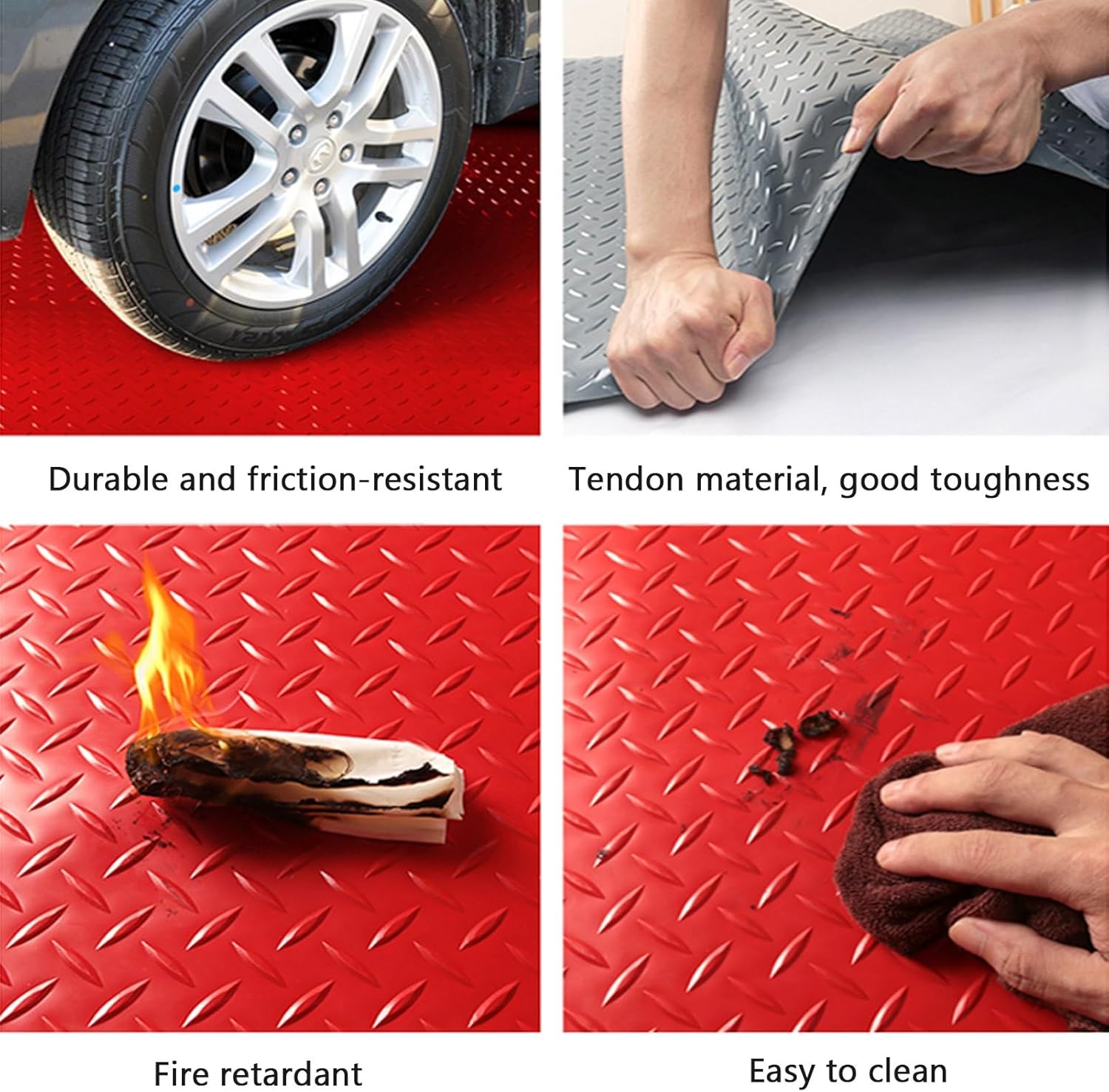 Our garage mats provide full protection for your floors, it prevents slips and stays securely in place, ensuring your mats do not move during use.Product name: wear-resistant floor matMaterial: PVCColor: Blue , Yellow , Pink , Green , Red , GreyThickness: 1.5mmFeatures: anti-slip/waterproof/wear-resistant/easy to cleanCleaning: rinse directly with waterScope of application: public places, stairs, bathrooms, toilets, swimming pools, corridors, workshops, warehouses, schools, store entrances, etc.Package includes:1x Garage Floor mat