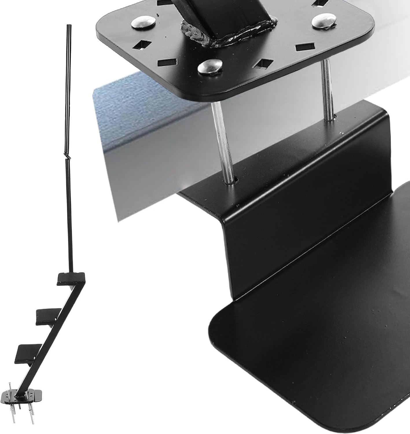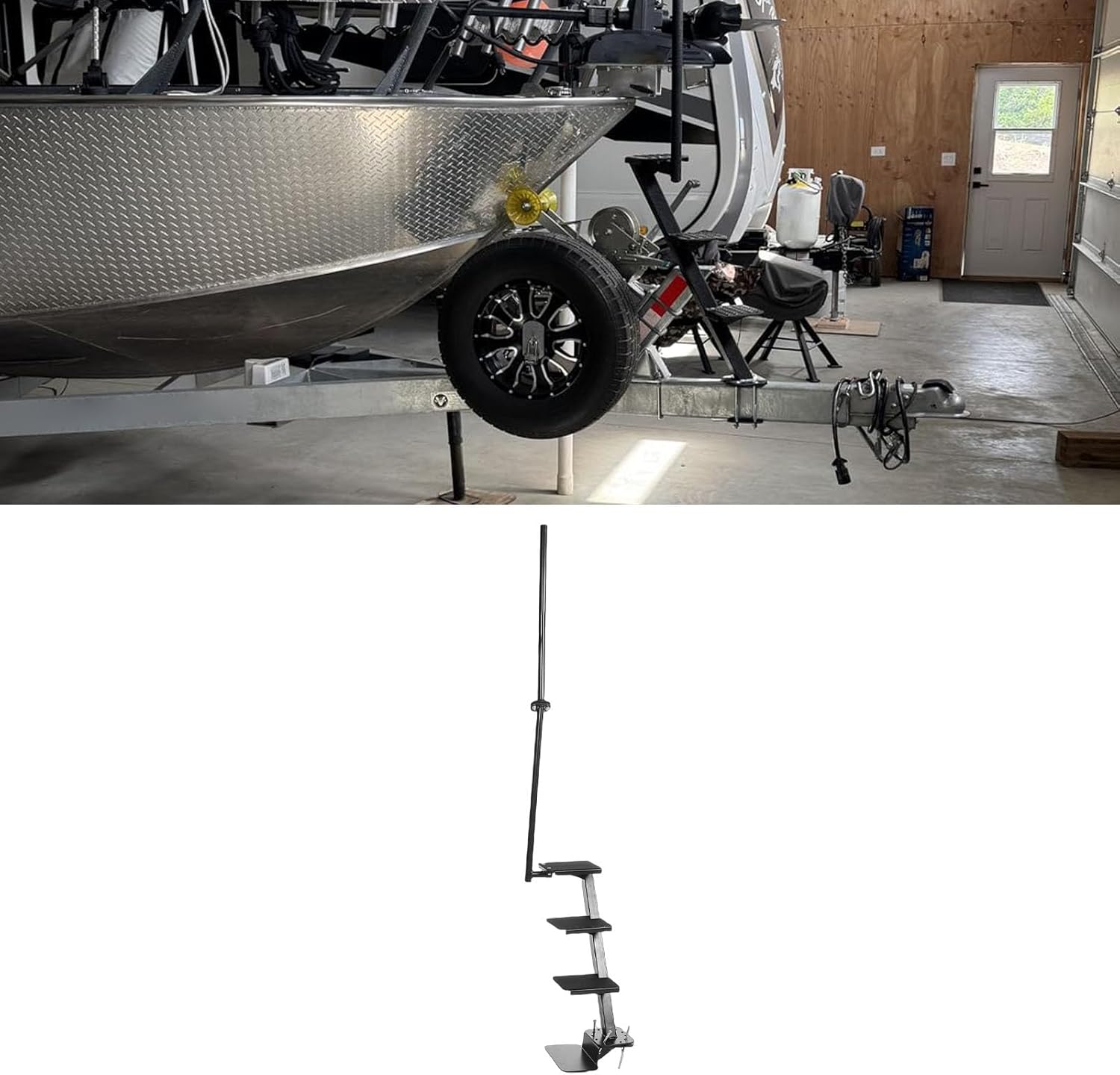 1. Sturdy and Durable: Boat trailer step is crafted with high strength solid steel construction and black powder coated finish offers excellent durability and long lasting performance. This sturdy structure enables the pedal to withstand harsh weather conditions 2. Enhanced Safety: 4 steps design provides a stable and secure boarding point. Sturdy triangular support and safety handrail further enhance safety, ensuring peace of mind every time you board. 3. Antislip Surface: Equipped with a non slip surface, providing a secure footing even in wet or rainy conditions. Significantly improves safety during boarding and eliminates slip hazards. 4. Adjustable Design: Boat trailer step comes with adjustable brackets and mounting hardware, can be easily installed on trailer beams with a width of 3 inches and a height ranging from 3.15 to 6.3 inches. You can easily and flexibly adapt it to your specific trailer configuration. 5. Stable Installation: Our boat trailer steps are replacement for deep V trailer most , providing a secure and stable installation that ensures you can confidently board and disembark from your boat. Specification: Item Type: 4 Steps Marine Trailer Step Material: Steel Surface Treatment: Black powder coating Application: Fits 3x3 inch and 3x5 inch trailer beams Fitment: Replacement for Deep V Most packing list: 1 x Boat Trailer Steps 1 x Installation Accessories Kit (32 Accessories)