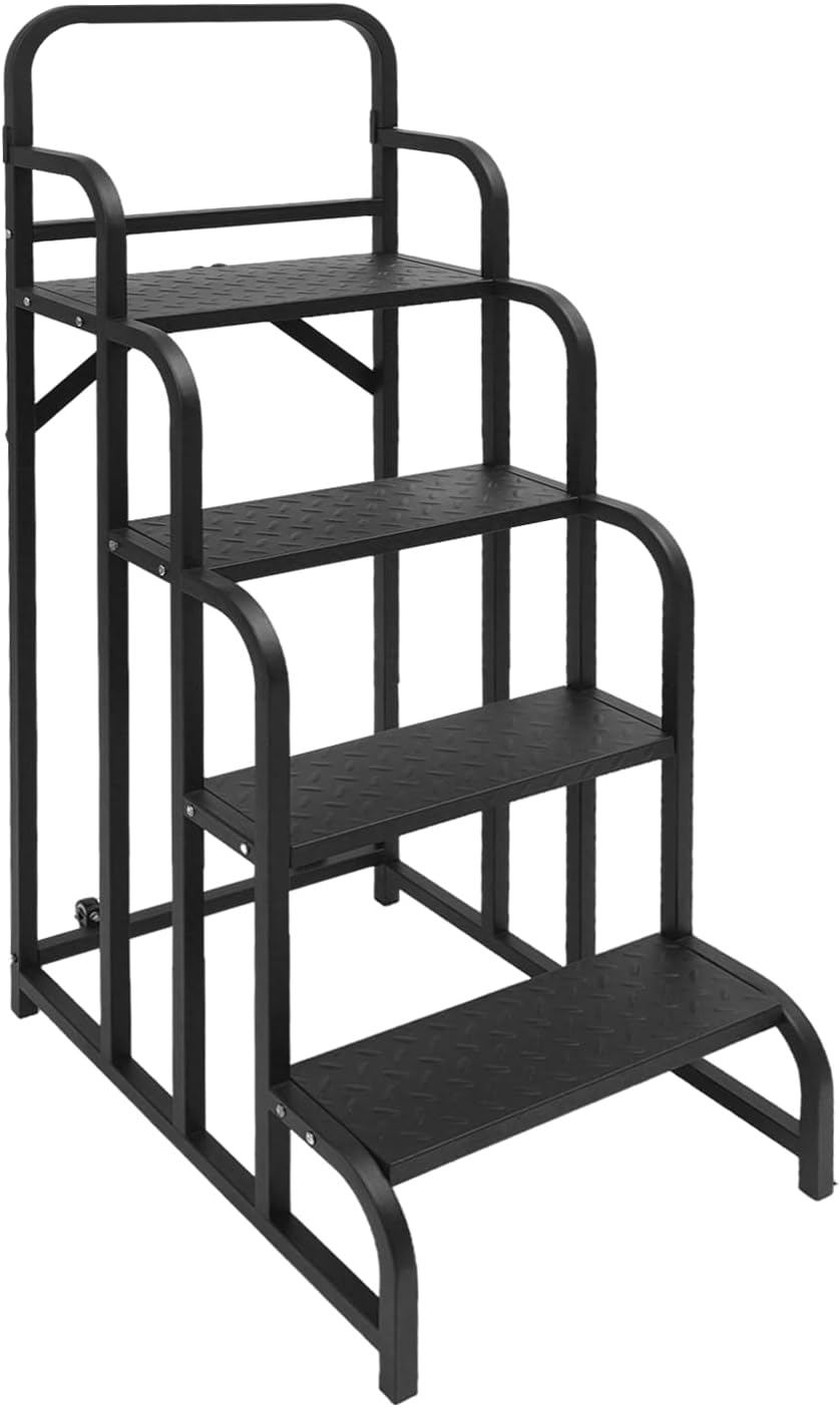 DescriptionThis 4-step stair serves as an essential safety tool for warehousing and logistics, retail, and numerous other scenarios requiring work at height. Designed to protect users’ personal safety while they complete high-altitude tasks, it boasts sturdiness thanks to the combination of premium materials and excellent craftsmanship. Its robust load-bearing capacity provides users with confidence in use, while the 2 equipped wheels make moving it simple.DetailsHandy Wheels: The product comes with 2 wheels that enable easy mobility, making it convenient to move it to different positions.Silky-smooth Edge: This product features a smooth, rounded edge design that not only gives it aesthetic appeal but also significantly improves safety during use, demonstrating extreme attention to detail and deep consideration for user care.ApplicationIt is suitable for households, warehouses, shops, supermarkets, libraries, etc. It can be used to reach high places for picking up or unloading goods, replacing light bulbs, cleaning windows, etc.SpecificationsColor: Black/WhiteMaterial: Carbon SteelProcess: Spray CoatingStyle: ModernAssembly Required: YesMounting Type: Floor StandingNumber of Wheels: 2Number of Steps: 4Total Load-bearing Capacity: 150kg/330.69lbsProduct Size: 55*76*139cm/21.65*29.92*54.72inStep Width: 17.5cm/6.89in, 13cm/5.12in, 20cm/7.87inPackage Size: 121*80*10.5cm/47.64*31.5*4.13inGross Weight: 21kg/46.3lbsNet Weight: 18.25kg/40.23lbsPackage Included1* 4-step Stair1* English Installation Diagram2* WheelsAll Accessories for AssemblyNotes1. Please check the size carefully before ordering.2. Please carefully read the English installation diagram before installation.3. Please use this product within the load-bearing range.