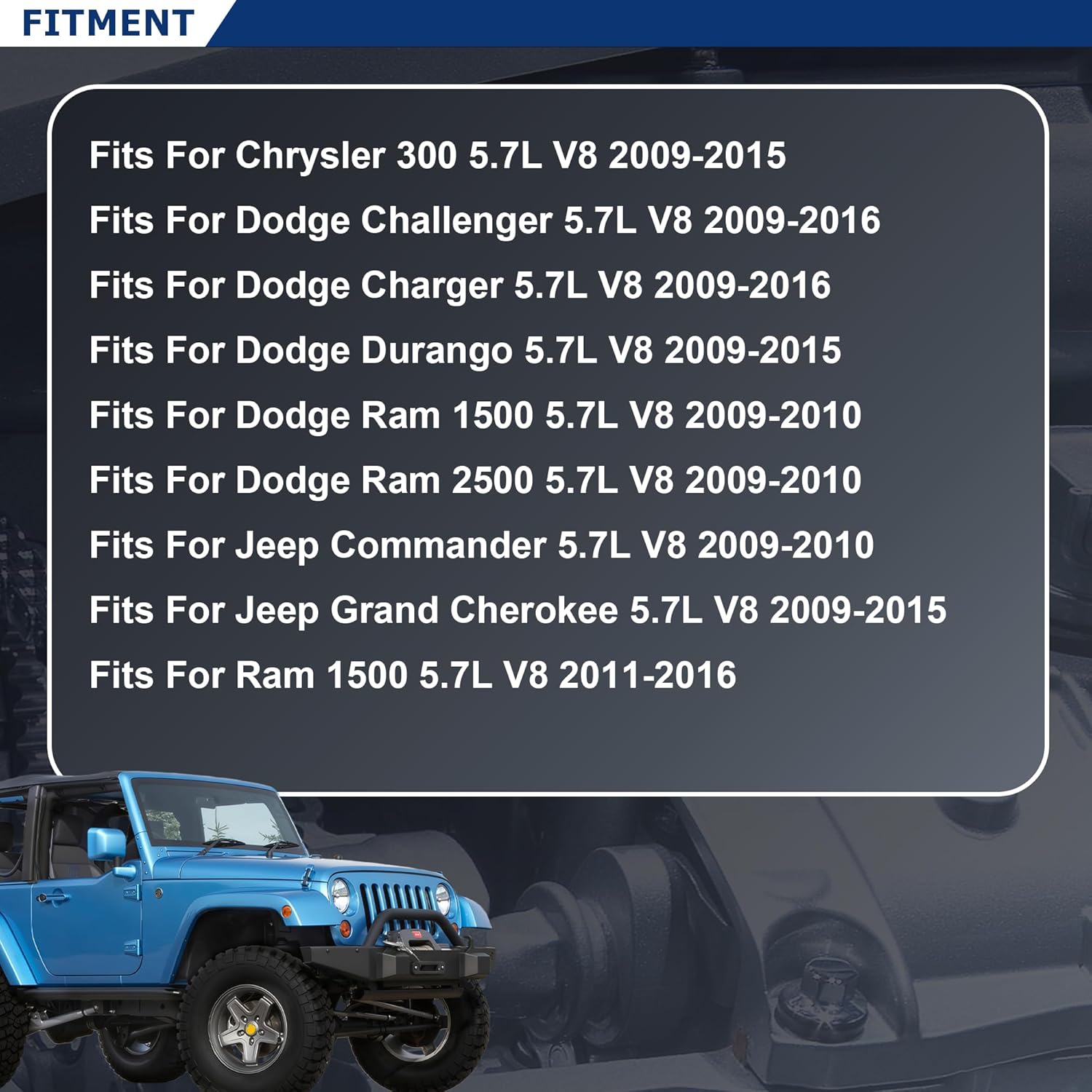- 【Fitment】 Fits For Chrysler 300 5.7L V8 2009-2015; Fits For Dodge Challenger 5.7L V8 2009-2016; Fits For Dodge Charger 5.7L V8 2009-2016; Fits For Dodge Durango 5.7L V8 2009-2015; Fits For Dodge Ram 1500 5.7L V8 2009-2010; Fits For Dodge Ram 2500 5.7L V8 2009-2010; Fits For Jeep Commander 5.7L V8 2009-2010; Fits For Jeep Grand Cherokee 5.7L V8 2009-2015; Fits For Ram 1500 5.7L V8 2011-2016;