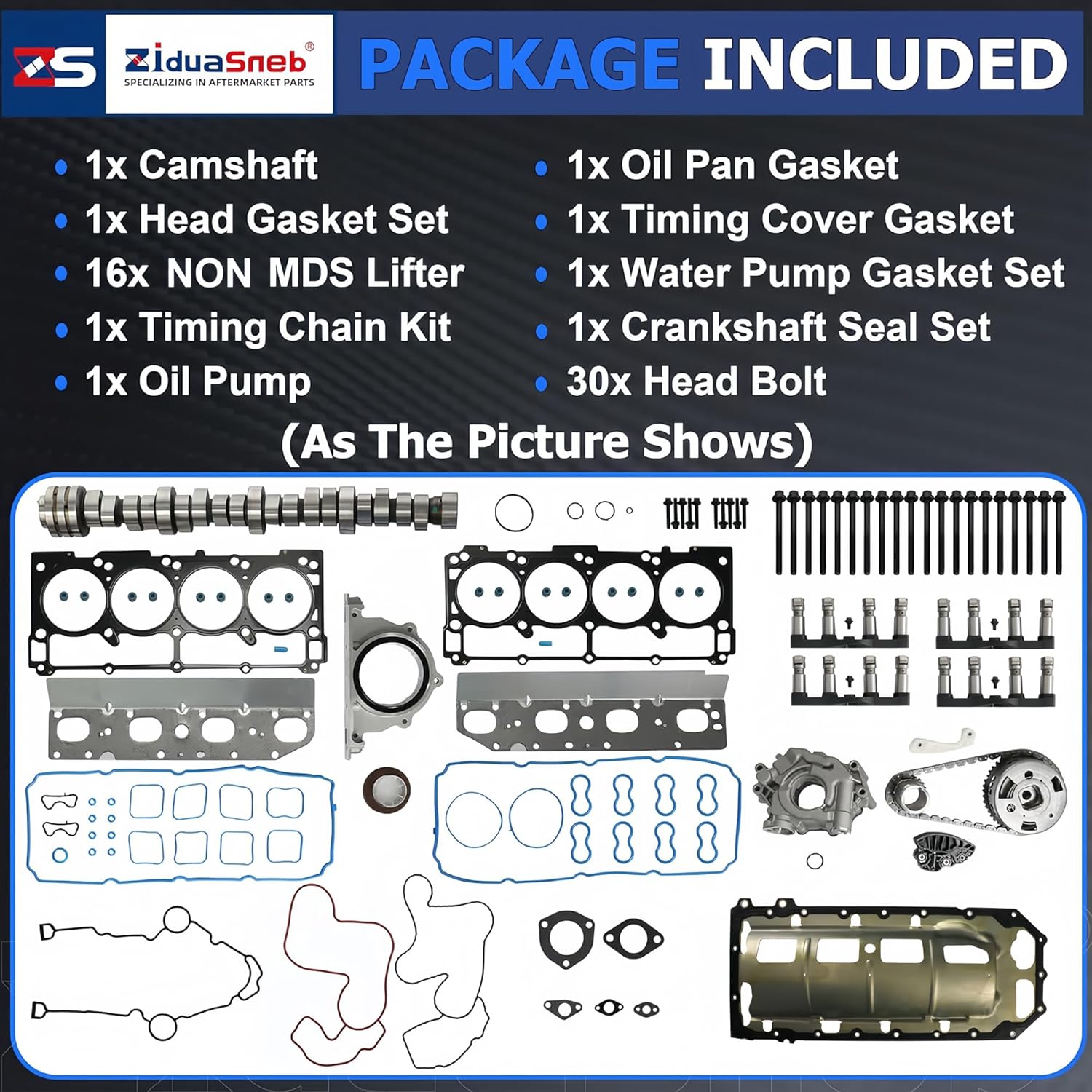 【Fitment】 Fits For Chrysler 300 5.7L V8 2009-2015Fits For Dodge Challenger 5.7L V8 2009-2016Fits For Dodge Charger 5.7L V8 2009-2016Fits For Dodge Durango 5.7L V8 2009-2015Fits For Dodge Ram 1500 5.7L V8 2009-2010Fits For Dodge Ram 2500 5.7L V8 2009-2010Fits For Jeep Commander 5.7L V8 2009-2010Fits For Jeep Grand Cherokee 5.7L V8 2009-2015Fits For Ram 1500 5.7L V8 2011-2016【OE Part Number】Camshaft: 53022372AANON MDS Valve Lifters: 5038686AA, 5038784AA, 5038784AB, 5038784AC, 5038784AD, 5038787AD, 53021572AA, 53021720AA, 53021720AB, 53021720AC, 53021720AD, 53021720AE, 53021720BBHead Gasket Set: HS26423PT, HS54418, HS54418B, CR345HS-COil Pan Gasket: 4792874AA, 04792874AA, OS30761RTiming Cover Gasket: TCS46169Rear Crankshaft Seal: BS40684Head Bolt: ES7220Oil Pump: M452Timing Chain Kit:90750S, 3750SX, 53022316AC, C750, 53022243AF, VVT604, 53022317AC, S949, 53022115AH,4893429AA[Please Check the Picture, OE Part Number and Fitment Information Whether You Need Before Purchase]【Package Includes】1 x Camshaft16 x NON MDS Lifter4 x Lifter Base1 x Head Gasket Set1 x Oil Pan Gasket1 x Oil Pump1 x Timing Chain Kit30 x Head Bolt (20x Long/10x Short) (As The Main Picture Shows)