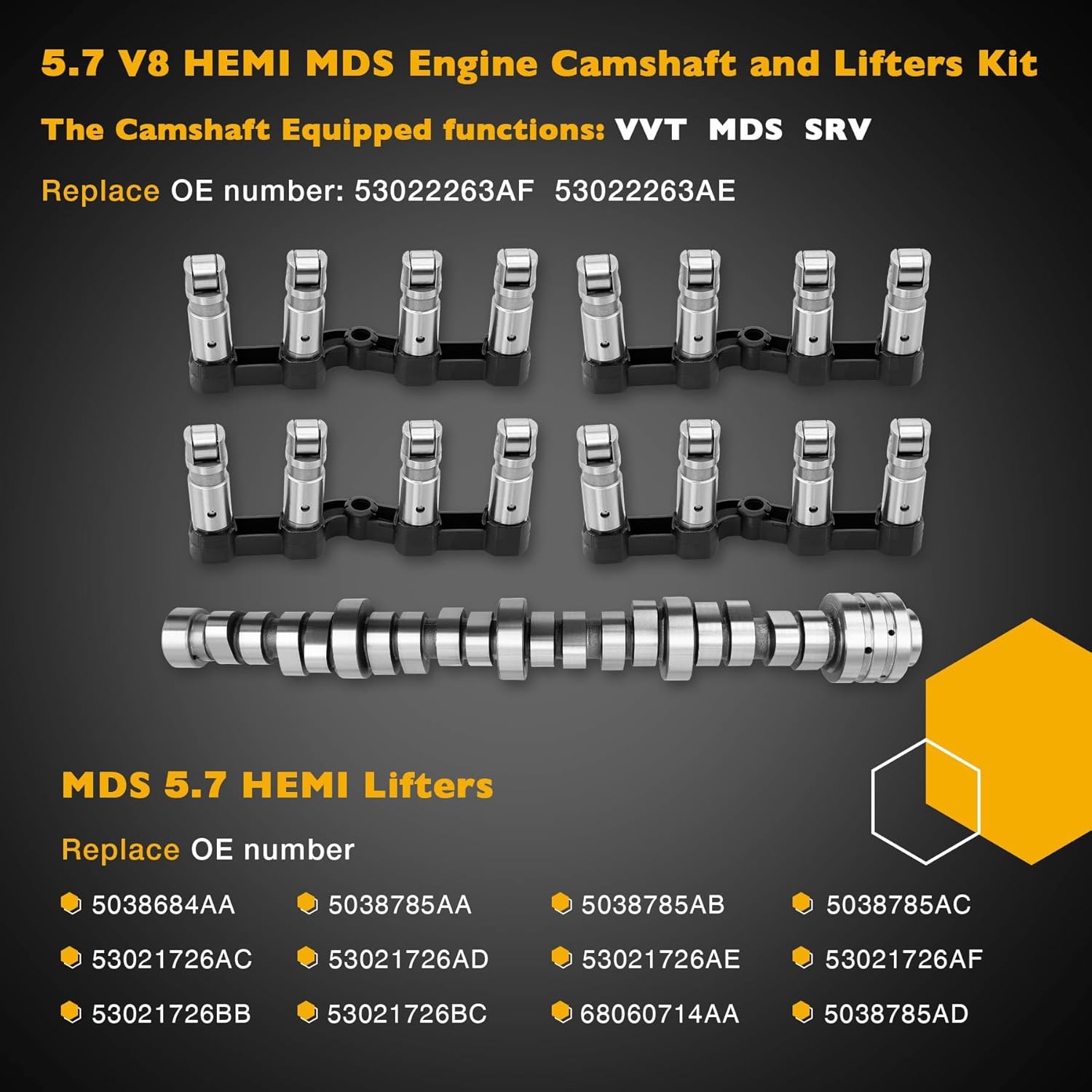 Compatible with:2009 Chrysler Aspen 5.7L Hemi V82009 Dodge Durango 5.7L Hemi V82009-2010 Dodge Ram 1500 5.7L Hemi V82011-2015 Ram 1500 5.7L Hemi V8The Camshaft Equipped functions:VVT MDS SRVReplace OE number:53022263AF 53022263AE MDS 5.7 HEMI LiftersReplace OE number:5038684AA 5038785AA 5038785AB 5038785AC53021726AC 53021726AD 53021726AE 53021726AF53021726BB 53021726BC 68060714AA 5038785AD5.7L Timing Chain KitReplace OE number:53022243AF153022243AA53022243AE68362151AAEngine Oil PumpReplace OE number:53021622BH 53021622BB 53021622BE 53021622BF 53021622BGBelt Driven Water PumpReplace OE number:68346912AA 53022192AF53022192AG 53022192AI53022192AJ 53022192AKAttentionPlease make sure your vehicle's year, make, model and engine size before you purchase this item. If you are not sure this item will fit your vehicle, please contactl us. At Gledewen, we take pride in the quality of our products and in your satisfaction. If you have any problems, do not hesitate to contact us.