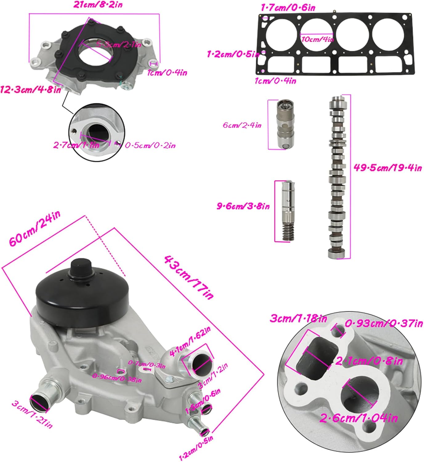 Part Number: AFM Lifters Replaces 12569256, 12571595, 12632143, 12619820, 12639516, 12645725, 12680871Roller Lifters Replaces 17122490, 17120735, 12499225, 12576400, 12648846, 25341990, 5235498, 5234890, 5234670, 5233745, 17121905, 17120090, 17089852, 5234660, 17109057Camshaft Replaces ES3588, 12625436Water Pump Replaces AW6009, 12600767, 12681417Timing Chain Kit Replaces 12646386, 12591689, 12556582, 12626407, TS13227Camshaft Retainer Thrust Plate w/ Bolts Replaces 12589016Compatibility:Replacement for Buick Rainier 5.3l 2005-2007Replacement for Chevy Avalanche 5.3l 2007-2013Replacement for Chevy Silverado 1500 Classic 5.3l 2007Replacement for Chevy Silverado 1500 5.3l 2005-2013Replacement for Chevy Suburban 1500 5.3l 2007-2014Replacement for Chevy Suburban 5.3l 2014Replacement for Chevy Tahoe 5.3l 2007-2014Replacement for Chevy Trailblazer Ext 5.3l 2005-2006Replacement for Chevy Trailblazer 5.3l 2006-2008Replacement for GMC Envoy Xl 5.3l 2005-2006Replacement for GMC Envoy Xuv 5.3l 2005Replacement for GMC Envoy 5.3l 2005-2009Replacement for GMC Sierra 1500 Classic 5.3l 2007Replacement for GMC Sierra 1500 5.3l 2005-2013Replacement for GMC Sierra 5.3l 2010-2013Replacement for GMC Yukon Xl 1500 5.3l 2007-2014Replacement for GMC Yukon 5.3l 2008-2014Replacement for Isuzu Ascender 5.3l 2005-2006