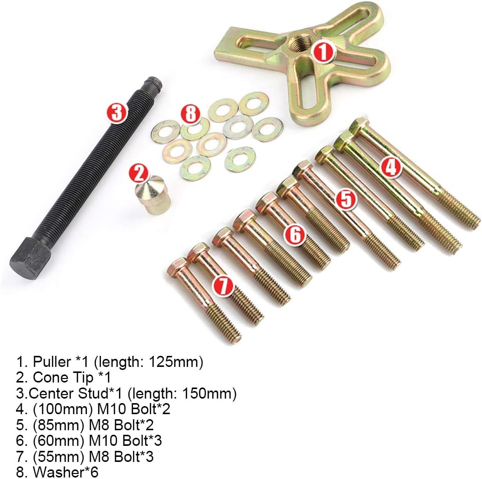 Specification:Material: AlloyPuller Length: 125mm / 4.9inCenter Stud Length: 150mm / 5.9inPackage List:1 x Puller1 x Cone Tip1 x Center Stud2 x M10 Bolts(100mm)2 x M8 Bolts(85mm)3 x M10 Bolts(60mm)3 x M8 Bolts(55mm)6 x Washers