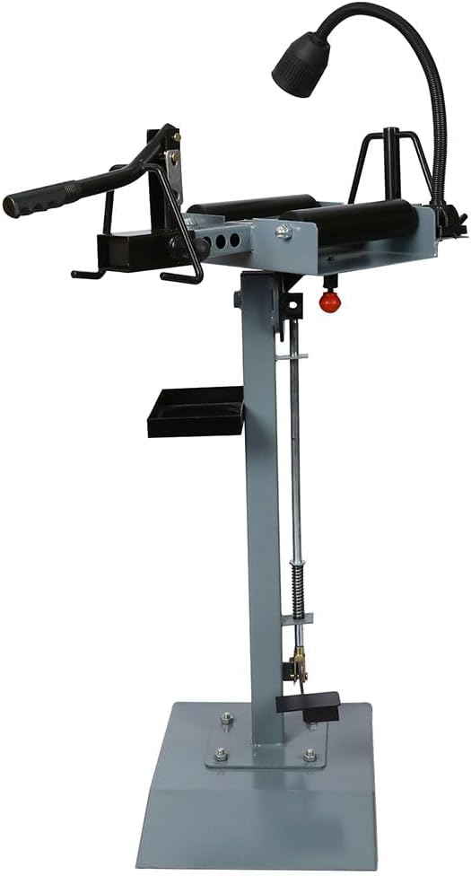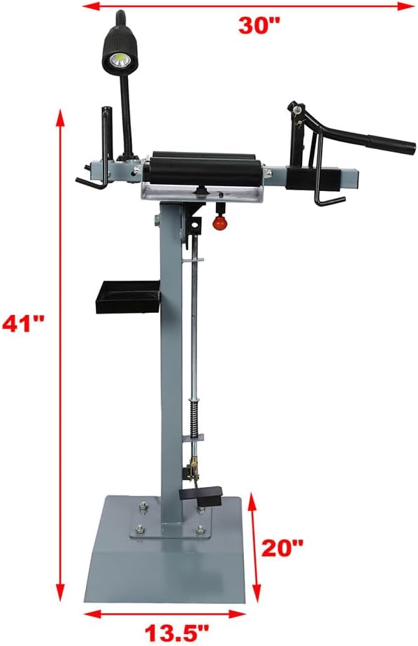 Product FeaturesFit for Tires of Various Sizes: 360° Swivel platform; Tire spread: 3.34"; Maxium Tire width: 9"; 90° Maximum tilt; Spreader position adjustment: 7; Biggest enlargement: 14".Pedal-operated: By controlling the pedal, you can adjust the table tilt angle. Tilting head allows repair work to be done at eye level.Adjustable LED Light: The manual tire spreader has a LED working light that can be adjusted flexibly. It all makes the repairing work more quickly and conveniently.Manual Car Tire Spreader: This Tires Changer/Spreader (with a working light) is designed for tire fixing spreading when repairing car tires. The available operations include tire inspecting, cutting, buffing, dust suctioning, tubes, and patching. SpecificationMain Color: GrayMain Material: MetalProduct Dimensions: 13.50"×20.00"×30.00"Weight: 48.00lbsPackage Size: 34.60"×15.00"×8.30"Weight: 50.50lbs