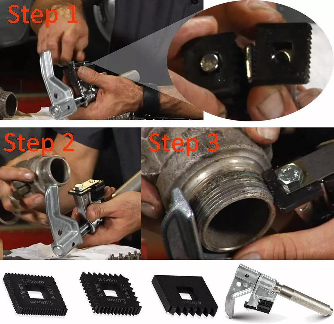 7402 Universal Outside Thread Chaser Will work on all types of threads with diameters of 1-1/4” to 5” O.D. Reason for buying it Damaged bolt or nut threads can be an annoying, costly problem-unless you have one of our thread chasers. This thread chaser will quickly restore threads to near original condition without the use of expensive thread-cutting equipment. Features The die cast alloy V-pad will not damage the threads. Replaceable V-pads and dies Capacity: 1-1/4"-5" OD Thread chaser standard die set (216884). Includes 6 4-Sided dies, in the sizes listed below:Threads per inch - 4, 5, 6, 7, 7-1/2, 8, 9, 10,11, 11-1/2, 12, 14, 16, 18, 20 and 24. Easy operation Simply tighten the tool slightly on the good threads then back it off over the damaged thread area to restore threads quickly and accurately. Package Includes: 1 pc 7402 Universal Outside Thread Chaser includes standard die set (216884) Please feel free to contact us if you have any question about our product,Thank you!
