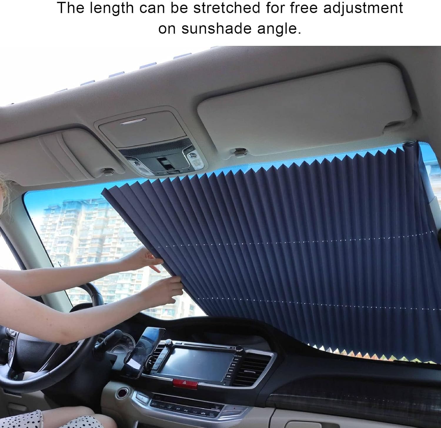 Specification:Item Type: Retractable Car Sun ShadeWidth: Approx. 70cm / 27.56inLength: Can be stretched to 155cm / 61.02in, approx. Product Material: Aluminium FoilInstallation : Suction cup type. Applicable : Universalpacking list:1 xRetractable Car Sun Shade
