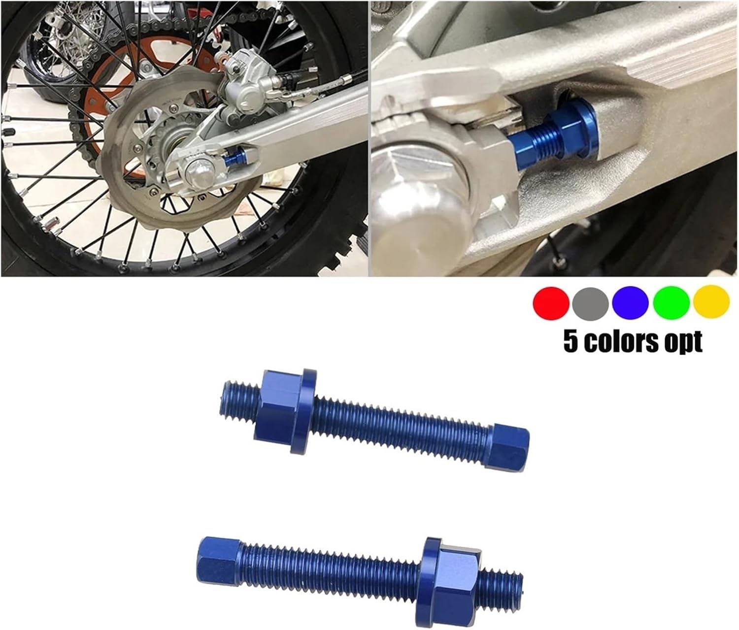 Motorcycles Accessories M8 Chain Rear Adjuster Bolt Nuts compatible with YAMAHA SUZUKI Dirt Bike Universal PartsFeatures:-- Condition: 100% Brand New-- Type: Chain Adjuster Bolt-- Material: T61 Aluminum-- Color: As shown-- Surface Finish: Anodized-- Perfect compatible with & Replaces as factory bolts2-M8x50 head hex bolts & 2M8 flange nuts to match- Easy to install8Fitment:compatible with XR650R 00-07compatible with CRF450RX 17-25compatible with CRF450R 02-25compatible with CRF450L 19-20compatible with CRF450X 04-25compatible with CRF250X 04-25compatible with CRF250RX 19-25compatible with CRF250R 04-25compatible with CRF250M 12-21compatible with CRF250 RALLY 21-25compatible with CRF250L 21-25compatible with CRF150R 07-24compatible with CR250 87-07compatible with CR125R 87-07compatible with YAMAHA YZ65 18-25compatible with YAMAHA YZ450FX 15-25compatible with YAMAHA YZ450F 98-25compatible with YAMAHA YZ426F 98-25compatible with YAMAHA YZ400F 98-25compatible with YAMAHA YZ250X 16-25compatible with YAMAHA YZ250FX 15-25compatible with YAMAHA YZ250F 01-25compatible with YAMAHA YZ125X 16-25compatible with YAMAHA YZ125 90-25compatible with YAMAHA WR450F 98-25compatible with YAMAHA WR400F 98-25compatible with YAMAHA WR250X 07-17compatible with YAMAHA WR250R 07-17compatible with YAMAHA WR250F 01-25compatible with YAMAHA TENERE700 20-24compatible with YAMAHA YZ85 19-25compatible with SUZUKI RM-Z450 05-24compatible with SUZUKI RM-Z250 04-24compatible with SUZUKI RM250 89-08compatible with SUZUKI RM125 89-08compatible with SUZUKI DR-Z400SM 05-09compatible with KX85 01-25compatible with KX450X 21compatible with KX450F 06-18compatible with KX450 19-21compatible with KX250X 21compatible with KX250F 04-18compatible with KX250 (2st) 88-98compatible with KX250 19-21compatible with KX250 (2st) 04-08compatible with KLX230 KL250 Sherpa 25compatible with KLX230S 25compatible with KLX230 25compatible with KX125 88-98compatible with KX125 04-08compatible with KX100 16-21compatible with KLX450R 08-15compatible with KLX250 08-20Package includes:1 set axle adjuster boltsHigh-concerned chemical : NoneItem Weight : 0.02kgItem Height : 2cmItem Width : 10cmItem Length : 15cmMaterial : AluminumOrigin : Mainland China
