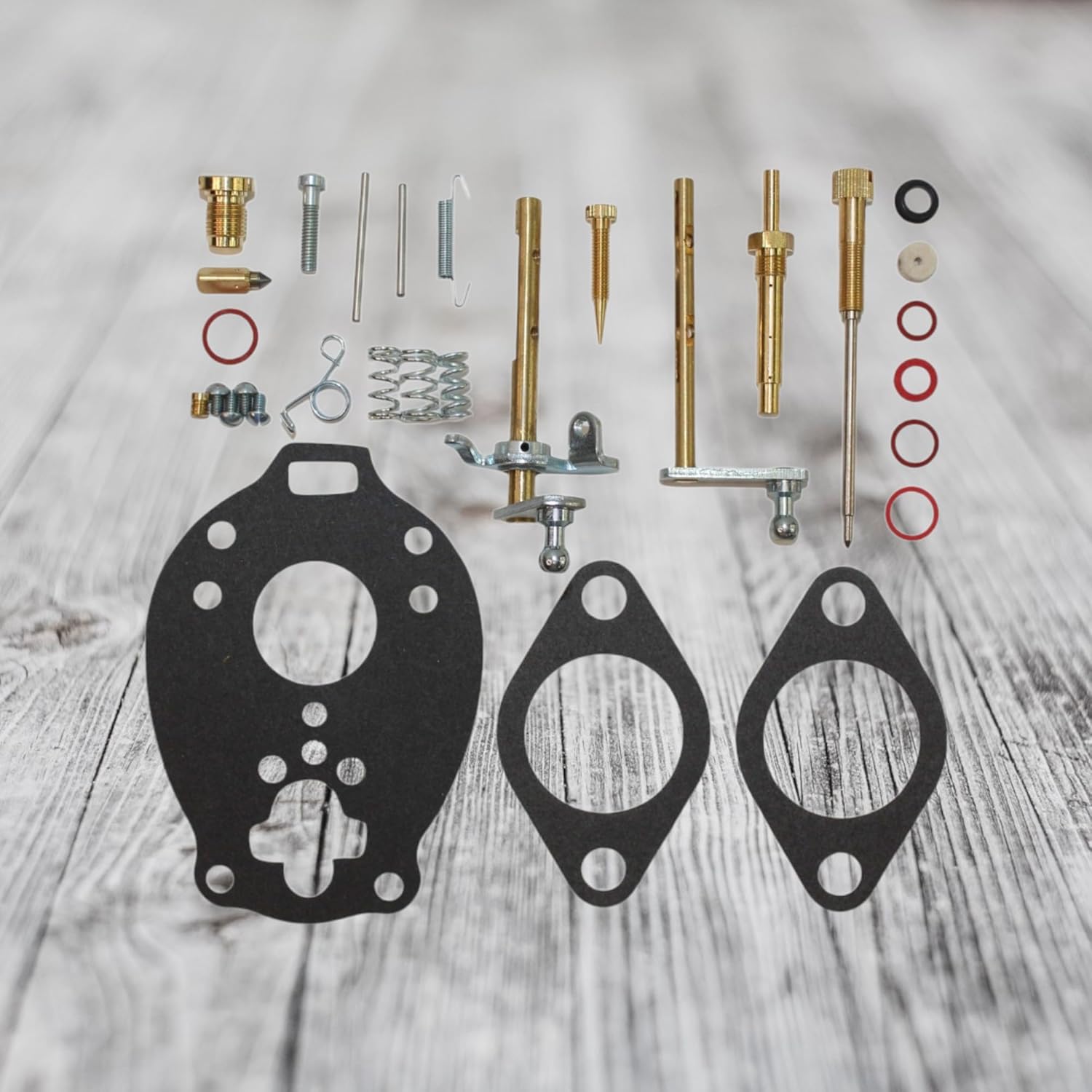 Enhanced Carburetor Repair Kit (For Marvel Schebler carburetors) Fits Ford Tractor Fits: Ford- (501, 601, 701 1957-1962); 2000 4-cyl.1962-1964 (All w/ TSX 765) Specifications Kit includes: choke and throttle shafts needle and seat valve float lever pin miscellaneous plugs and screws throttle shaft seals gaskets Includes parts shown in picture above. This is for reassembly purposes only, instruction sheet may depict parts that are not included in this kit. Carb Numbers TSX765 312954 Fits the listed Marvel Schebler carbs in use on tractors with 134 cubic inch gas engine. Make sure to find your carb manufacturer number in the list above. If your number is not listed, this kit is not the correct kit for your application. All JJAgParts items have been hand selected by our team and are continuously monitored for Quality. Should a craftsmanship or fitment concern be identified, JJAgParts will work with you to stand behind our products. JJAgParts is an American owned and operated family business! Here at JJAgParts, we strive for customer satisfaction. If you are not satisfied with your order, please contact us so we can make it right. Note: OEM Part Numbers are for reference only and should be verified before purchase."