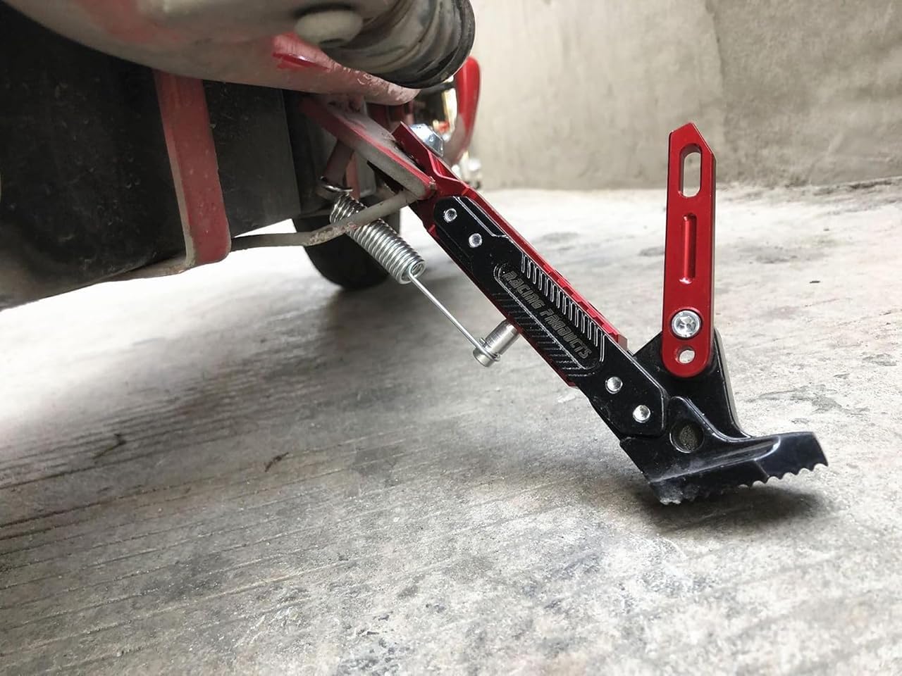 【FEATURES】✔ HIGH-QUALITY MATERIALMade of lightweight, sturdy aluminum alloy, this ensures durability.✔ ADJUSTABLE HEIGHTEquipped with a flexible height adjustment mechanism, it can be precisely adjusted to suit the frame height, wheel size, and surface roughness of different motorcycles.✔ ENHANCED STABILITYThe base features a larger support plate to prevent it from sinking into soft sand or uneven surfaces.✔ EASY INSTALLATIONSimply secure the stand to the motorcycle frame, adjust to the desired height, tighten the screws, and install the spring. (the spring hole position is adjustable in two levels)【PACKAGE INCLUDES】1 * motorcycle kickstand【SATISIFIED CUSTOMER SERVIC】Your satisfaction is always our top priority.If you are satisfied with the product, please share it with more people.If you have any questions with our products, please feel free to contact us, we will reply and address your issue within one day.