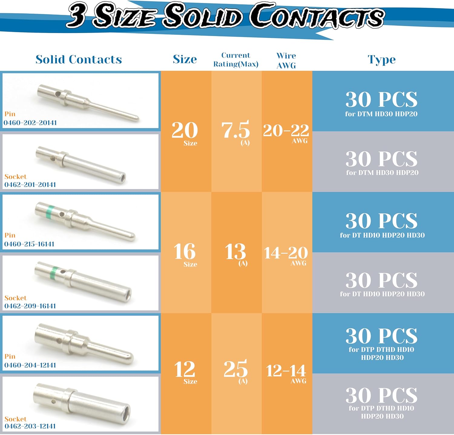 【Ultimate 3-in-1 Deutsch DT Solid Contacts Bundle】 This comprehensive kit includes 30 pairs of Size 16 DT contacts (0460-215-16141 / 0462-209-16141), 30 pairs of Size 20 DTM contacts (0460-202-16141 / 0462-201-16141), and 30 pairs of Size 12 DTP contacts (0460-204-12141 / 0462-203-12141). Plus, it comes with 30 seal plugs (114017) for complete cavity sealing.