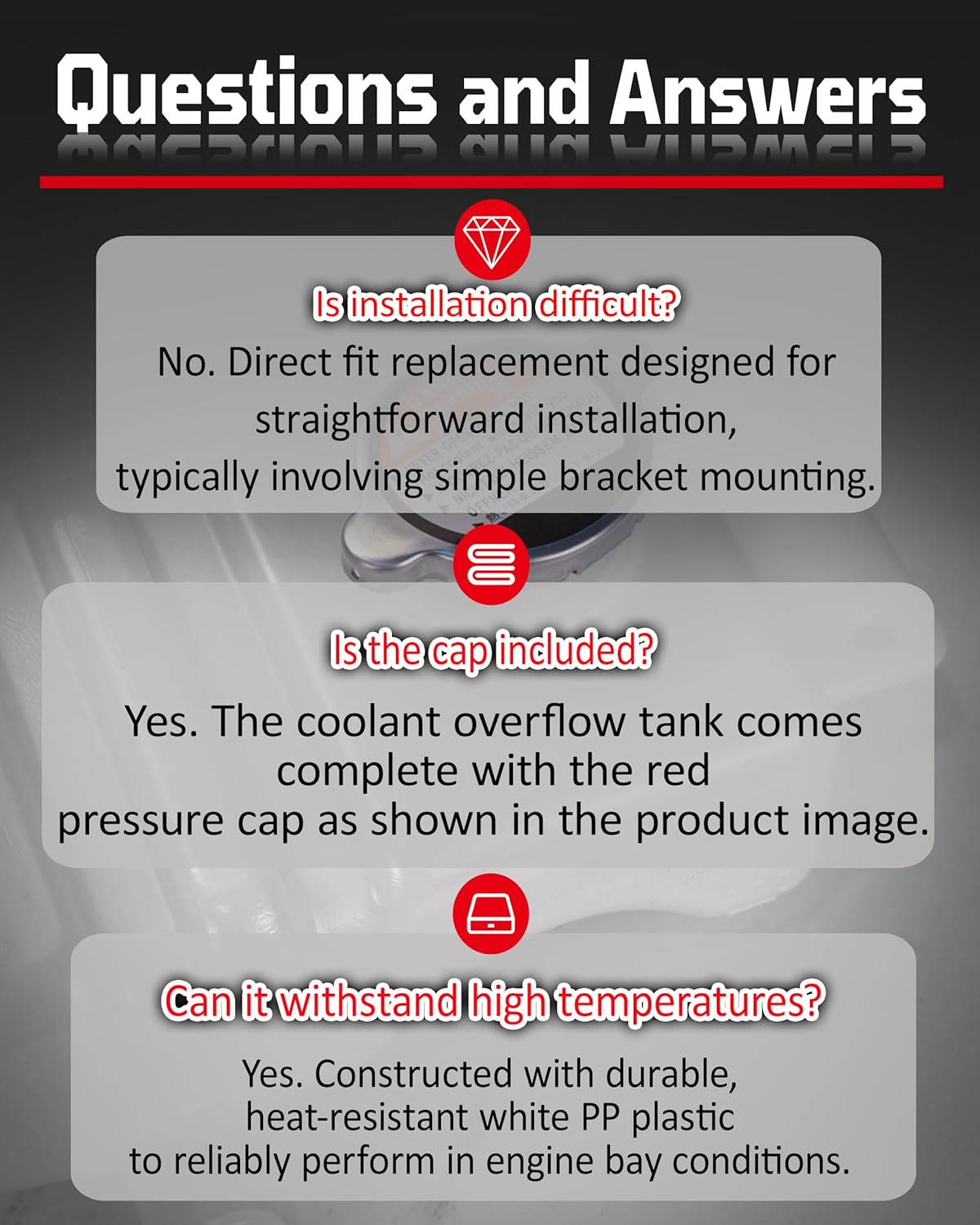 | Included Components | 1 Radiator Overflow Surge Tank |