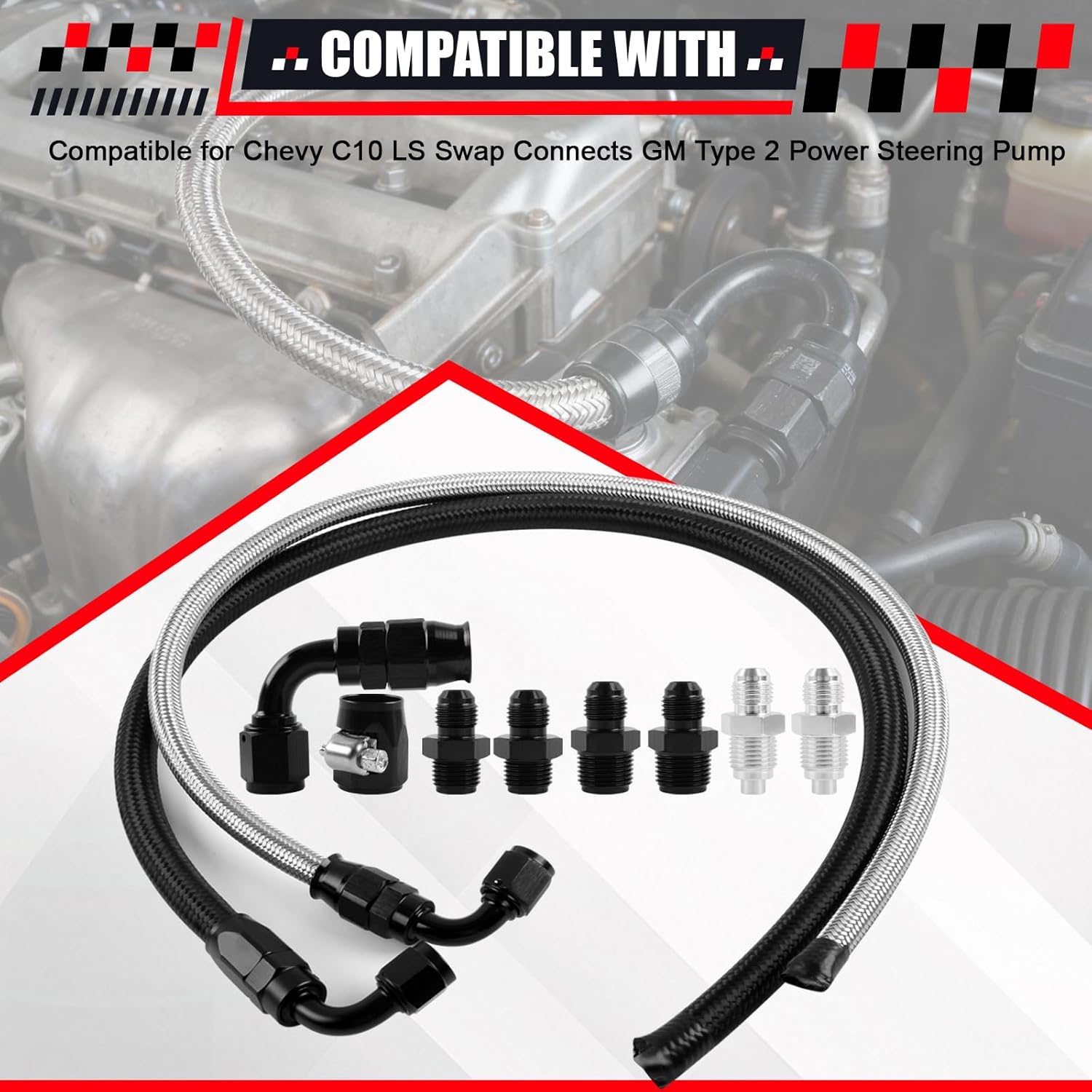 ZynoDrive High-Quality Universal Power Steering Hose Kit for GM LS Swap Chevy C10 1950-2000Package Including:1x Nylon braided low pressure hose with -6AN 90 degree fitting one side1x Stainless steel high pressure hose with -6AN 90 degree fitting one side1x Black Econ-O-Fit Hose Clamp1x 6AN 90° Teflon/ PTFE Hose Fitting2x 5/8"-18 to -6AN Adapter2x 11/16"-18 to -6AN Adapter2x M16x1.5 to -6AN AdapterStainless Braided Teflon Hose:Working Pressure: up to 3000psiBursting Pressure: 10000psiTemperature Range: -76℉ to 446℉Stainless Braided Rubber Hose:Working Pressure: up to 500psiBursting Pressure: 2000psiTemperature Range: -40℉ to 257℉Notes:1.Before purchasing, verify your model to confirm compatibility.2.Installation instructions are not included in the product packaging. For users without installation experience, we recommend professional installation at a professional facility.3.Inspect this Power Steering Hose for quality issues before installation. If any problems are found, contact us immediately—do not attempt to install it forcefully.4.We offer a 6-month warranty for non-human-caused damage. If you encounter any quality issues, contact us promptly, and we will assist you in resolving the matter.