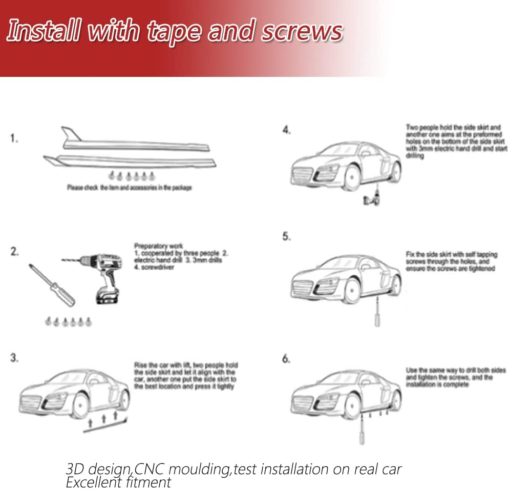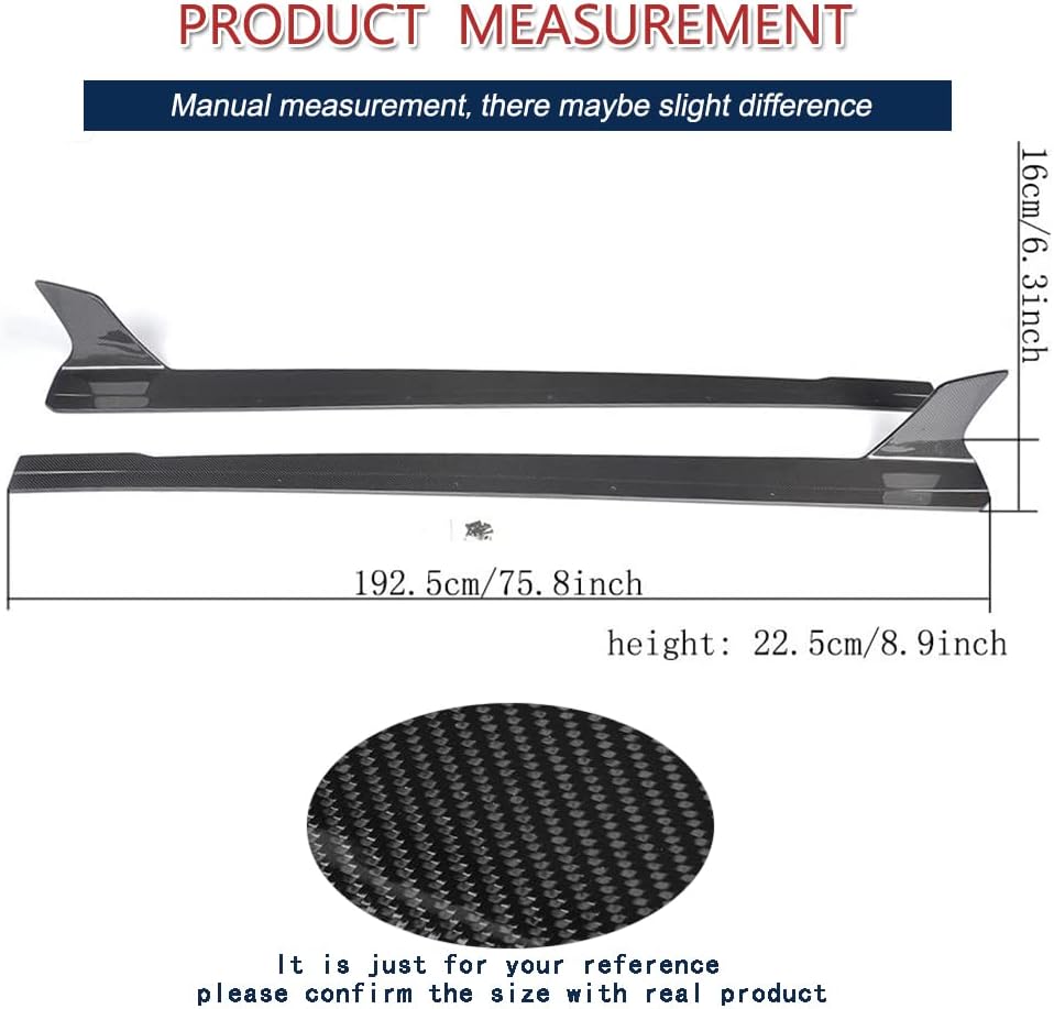 Features: 3k Twill Weave Carbon Fiber material Aggressive side aerodynamic package High Quality UV-Protected Clear Coating.Surface is shining and smooth While the side skirts don't affect the front ground clearance too much, it enhances the side extension in a very pure and exciting way. Specification: Fitment: Fits For Audi R8 V8 V10 GT Spyder Coupe Convertible 2-Door Years: 2008 2009 2010 2011 2012 2013 2014 2015 Position: Car side skirts Package Content: 1 Pair Side Skirts (2pcs) Instalaltion: 3M tape with tapping screw which makes the parts more durable.