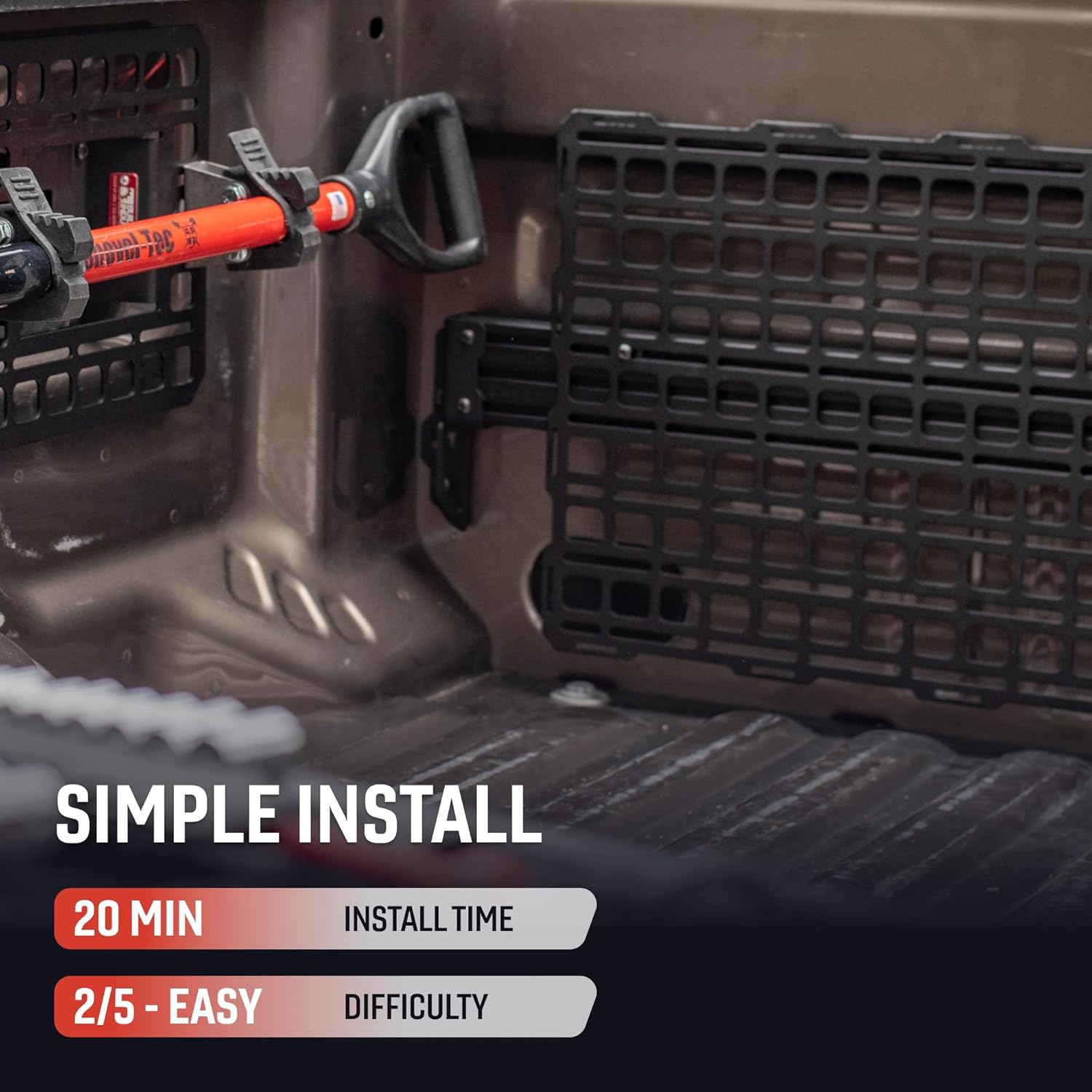 Enhance your Ford Super Duty truck's functionality with the BuiltRight Industries Bulkhead Accessory Rail System, specifically designed for 2017+ F-250, F-350, and F-450 models. This rail system offers a sturdy and organized solution for mounting tools, recovery gear, and other accessories on the cab wall, thereby optimizing your vehicle's storage capabilities. The robust construction ensures durability, while the design allows for easy, no-drill installation using factory mounting points. Customize your storage setup with a variety of MOLLE-compatible accessories to suit your needs and preferences.