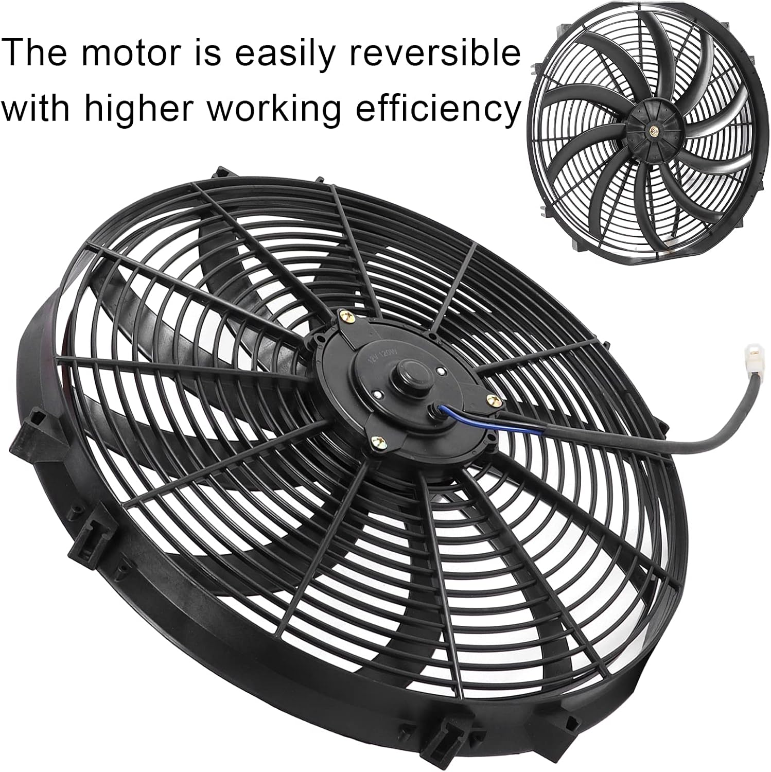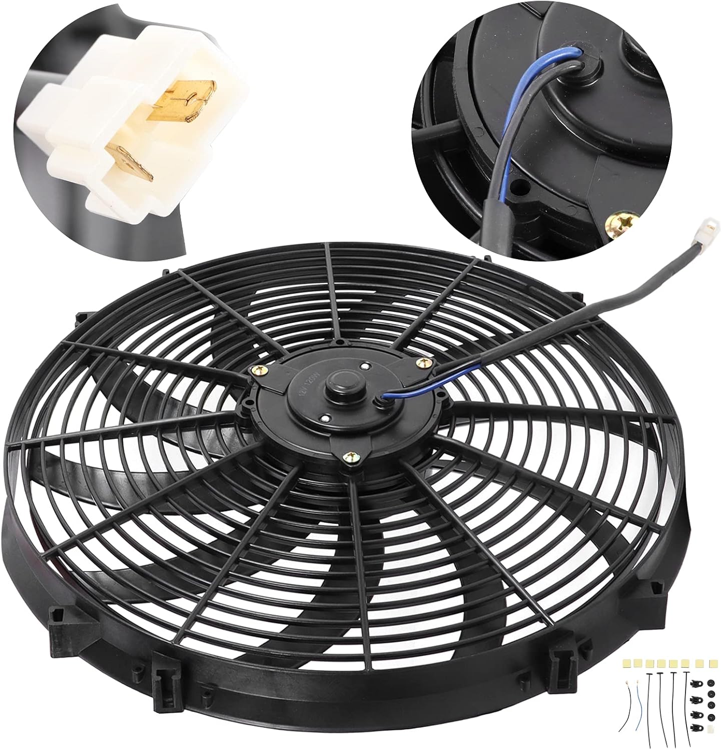 Item Type: Electric FanMaterial: ABS + Metal Colour: BlackApplication: Universal for air conditioning modification of cars, trucks, RVs, etc.Voltage: DC 12VPower: 120WAir Volume: 2250 RPMSize: 16 inchesHeat Dissipation Specifications: Up to 3000 CFMPackage List:1 x Fan8 x Sticker2 x Power Cord4 x Bracket9 x Small AccessoriesNote: